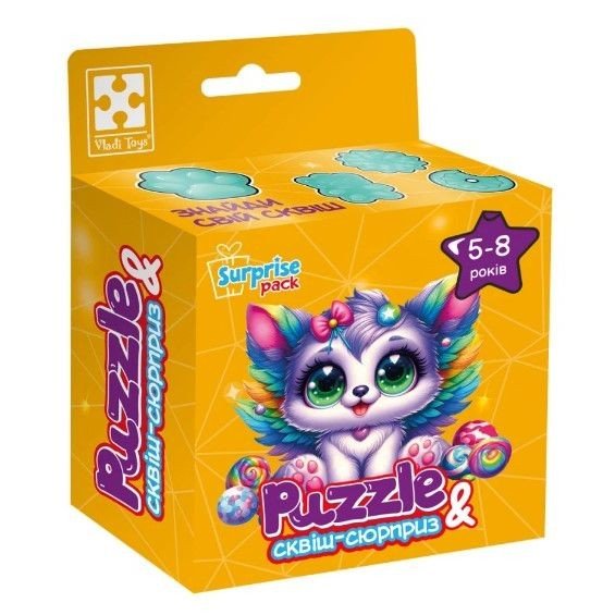 Бренд: Vladi Toys Вік: 5 років Упаковка: Коробка Колір: Різнобарв'я Вага з упаковкою: 115 г Габарити в упаковці: 5.5 x 10.5 x 14 см Країна виробник: Україна Матеріал: Комбінований Комплектація: сквіш, пазли