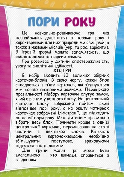 Пазли логічні "Пори року". У набір входить 10 великих збірних карток-блоків. У свою чергу, кожен блок складається з п'яти карток, які з'єднуються між собою пазловимі замками. На центральній картці блоку зображені ілюстрації, які підходять до даної фігурі. Мета дитини - правильно зібрати весь блок.