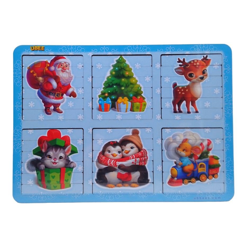 Деревʼяні двосторонні пазли-вкладиші у незвичайній формі. Деталі малюнків виконані у формі паличок. Кожна картинка складається із 6-ти елементів. На звороті кожного малюнка криється ще один рисунок. Всього з "Новорічного" набором пазлів дитина зможе скласти цілих 12 картинок.