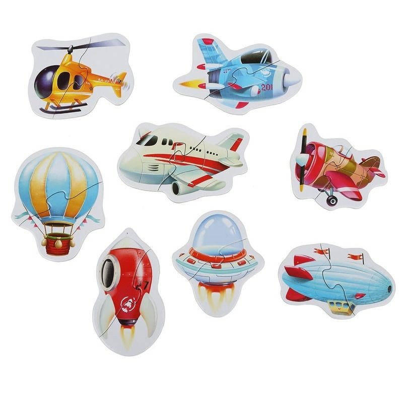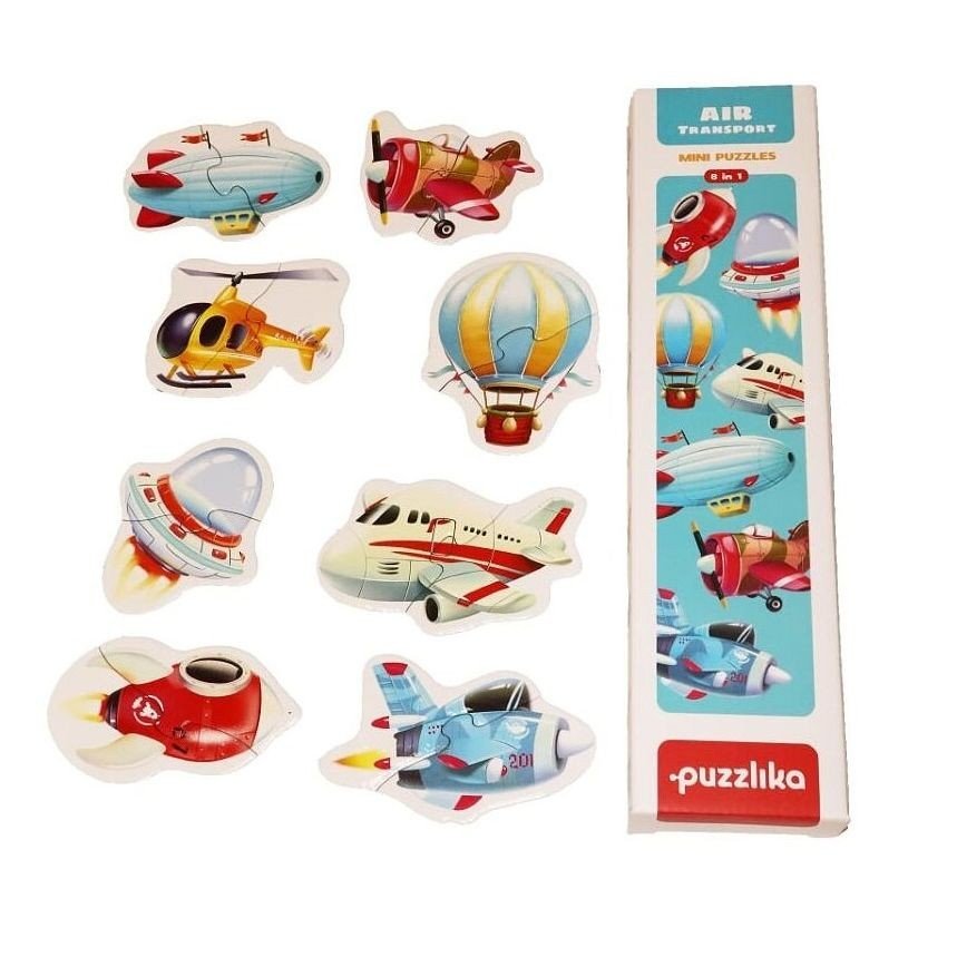 Пазли Повітряний транспорт. Набір привертає увагу дуже красивим та яскравим дизайном як коробки, так і того, що в ній. Чудово розвивають дрібну моторику, пам'ять і творче мислення. Розмір деталей та складність ідеально підібрано для маленьких ручок. Всього 16 пазлів, які складаються у 8 картинок з повітряним транспортом. Всі розкладені по торбинках парами. Один пазл прикріплений до коробки. Виготовлено з якісних матеріалів.