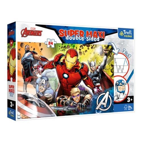 Яскраві барвисті двосторонні пазли на 24 деталі. Пазли із зображенням популярних героїв "Марвел". У комплекті є розмальовка. Розмір картки з персонажем, яку малюк може розмалювати: 60х40 см. Набір розвиває логічне мислення, дрібну моторику рук, посидючість. Для дітей віком від 3-х років.