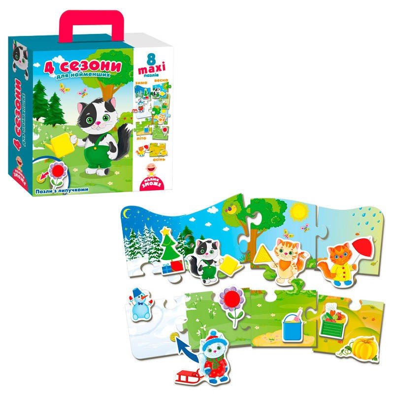Пазл з липучками для самих маленьких. Дитині спочатку потрібно буде скласти яскравий пазл, а потім розподілити кошенят і предмети по сезону. 8 максі пазлів і 10 картонних фігурок в комплекті.