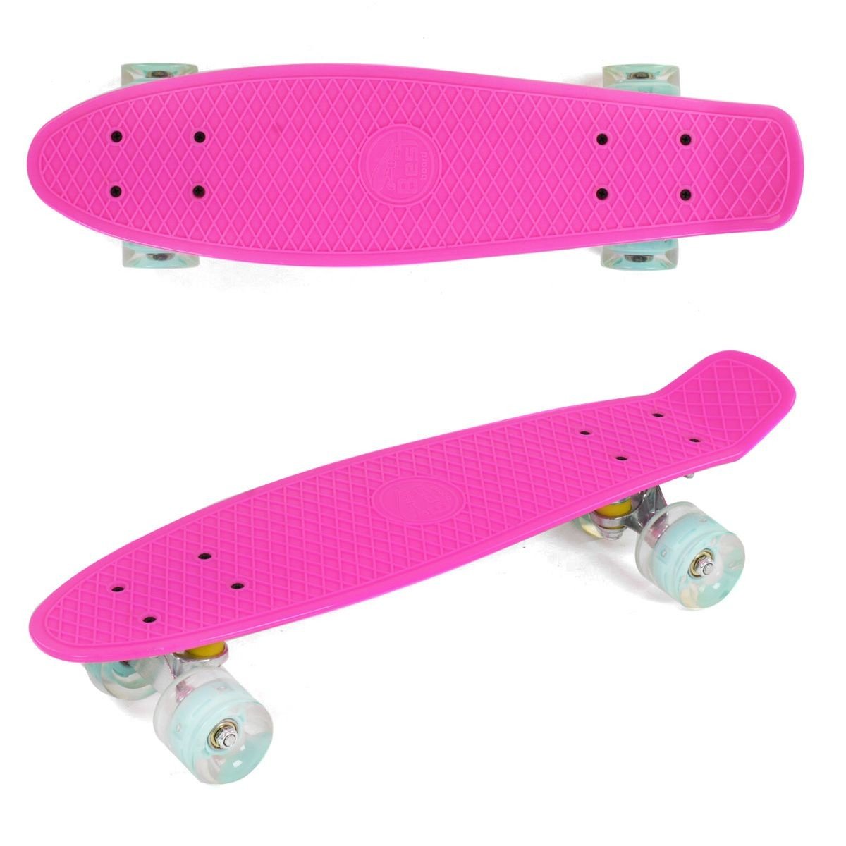 Пенні Борд з колесами, що світяться. Легка дека зроблена з міцного формованого пластика. Має протиковзку поверхню. Довжина деки - 55 см, ширина - 14,5 см. Колеса PU, зі світлом, d = 6 см. Підвіски: алюміній. Максимальне навантаження 70-80 кг.