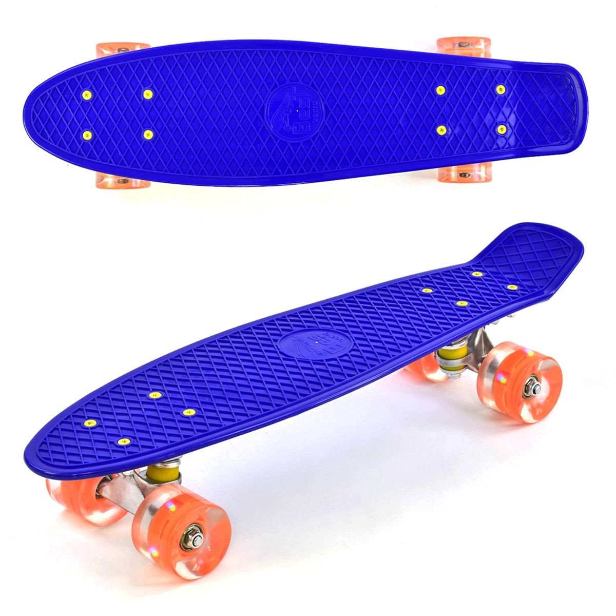 Пенні Борд з колесами, що світяться. Легка дека зроблена з міцного формованого пластика. Має протиковзку поверхню. Довжина деки - 55 см, ширина - 14,5 см. Колеса PU, зі світлом, d = 6 см. Підвіски: алюміній. Максимальне навантаження 70-80 кг.
