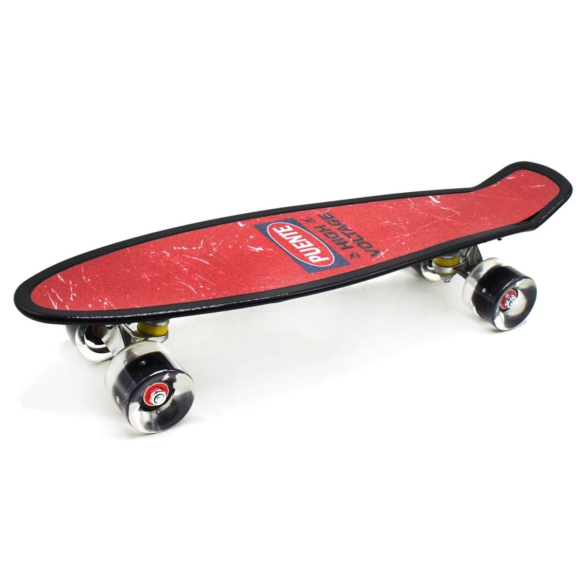Пенні борд з колесами, що світяться. Дека пенні борда виготовлена з жорсткого пластика і покрита анти-ковзною стрічкою. Покриття верхньої частини деки: кольоровий наждак (Grip Tape). Колеса скейта виконані з поліуретану, що робить катання безшумним. Кожне колесо світиться під час руху. Довжина деки - 56 см, ширина - 14,5 см. Колеса PU, зі світлом, d = 6 см. Підшипники: ABEC - 7. Підвіски: алюміній. Максимальне навантаження 70-80 кг.