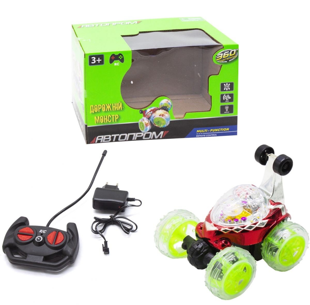 Іграшкова машинка-перевертень із серії "Автопром" має передню вісь, яка крутиться на 360 градусів, що дозволяє йому виконувати запаморочливі трюки при їзді. При виконанні трюків, щоб не перевернутися, машинка оснащена додатковими колесами. Розмір машинки - 17х17 см., Діаметр коліс - 7 см. Виконаний з якісного пластику. Для дітей від 3-х років.