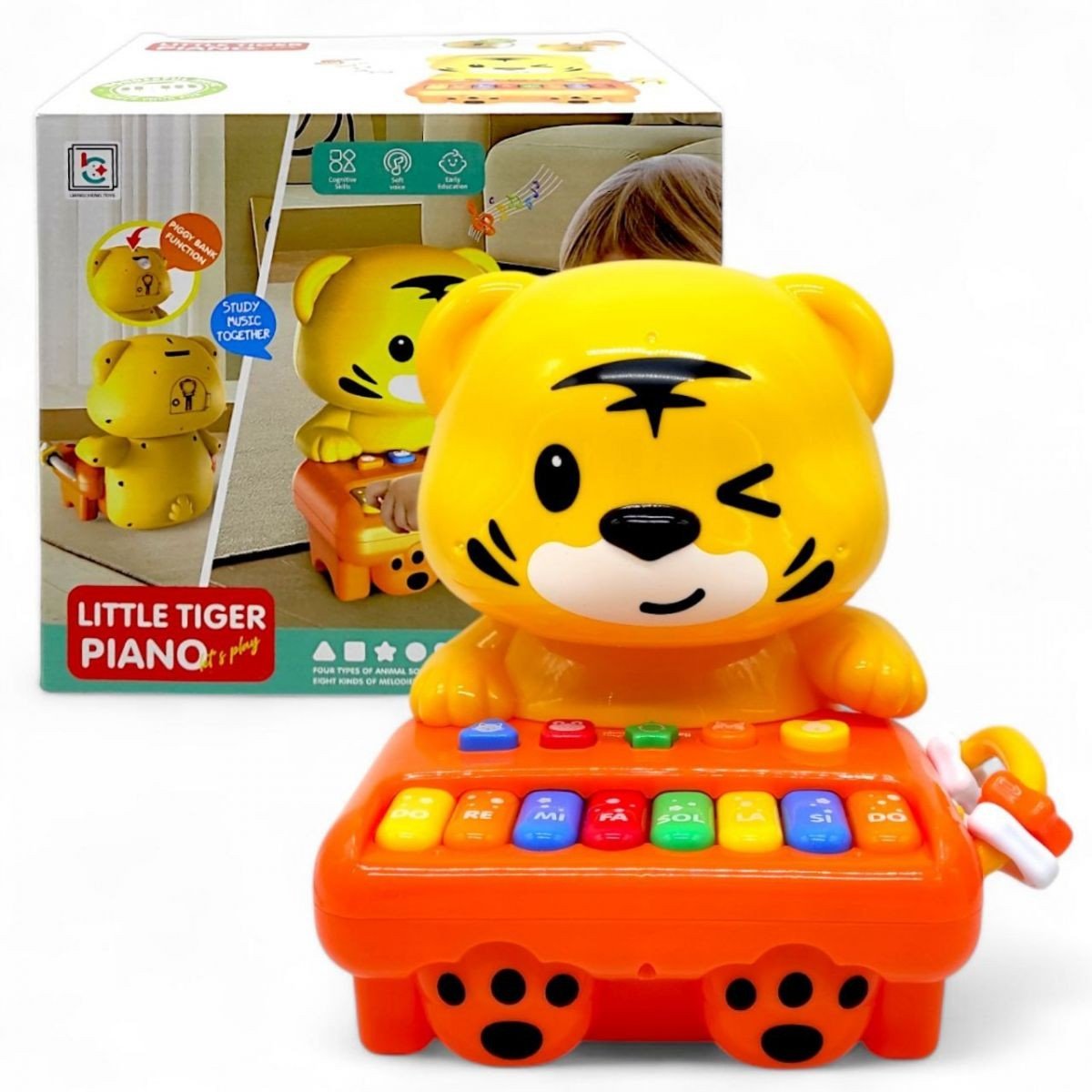 Цікава інтерактивна іграшка у вигляді тигрика, що тримає в лаках синтезатор. Поєднує в собі невеличкий музичний центр та скарбничку. На ігровій панелі розміщені кнопки та клавіші, які відтворюють мелодії та голоси тваринок. Під час активації підсвічуються деталі ігрової панелі. На голові тигра є отвір для монет а також дверцята з ключиком, аби ці самі монети зі скарбнички діставати. Розмір іграшки - 23х19х17 см. Працює від 3-х батарейок типу АА (до комплекту не входять). Рекомендовано для дітей старше 18 місяців.