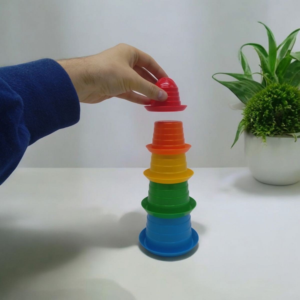 Пірамідка із 5 яскравих елементів. За допомогою цих форм можна робити різні фігурки в піску. Можна використовувати як лієчку-фонтанчик для купання.