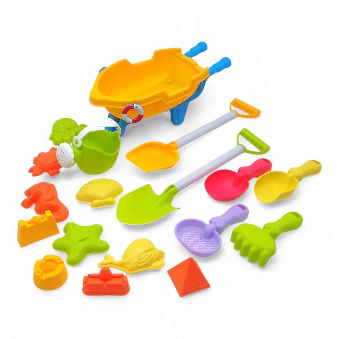 Бренд: MIC Упаковка: Сетка Колір: Різнобарв'я Вага з упаковкою: 250 г Габарити в упаковці: 16 x 19 x 13 см Країна виробник: Китай Матеріал: Пластик Комплектація: Тачка, граблі, лопатки, сито, лійка, 10 формочок