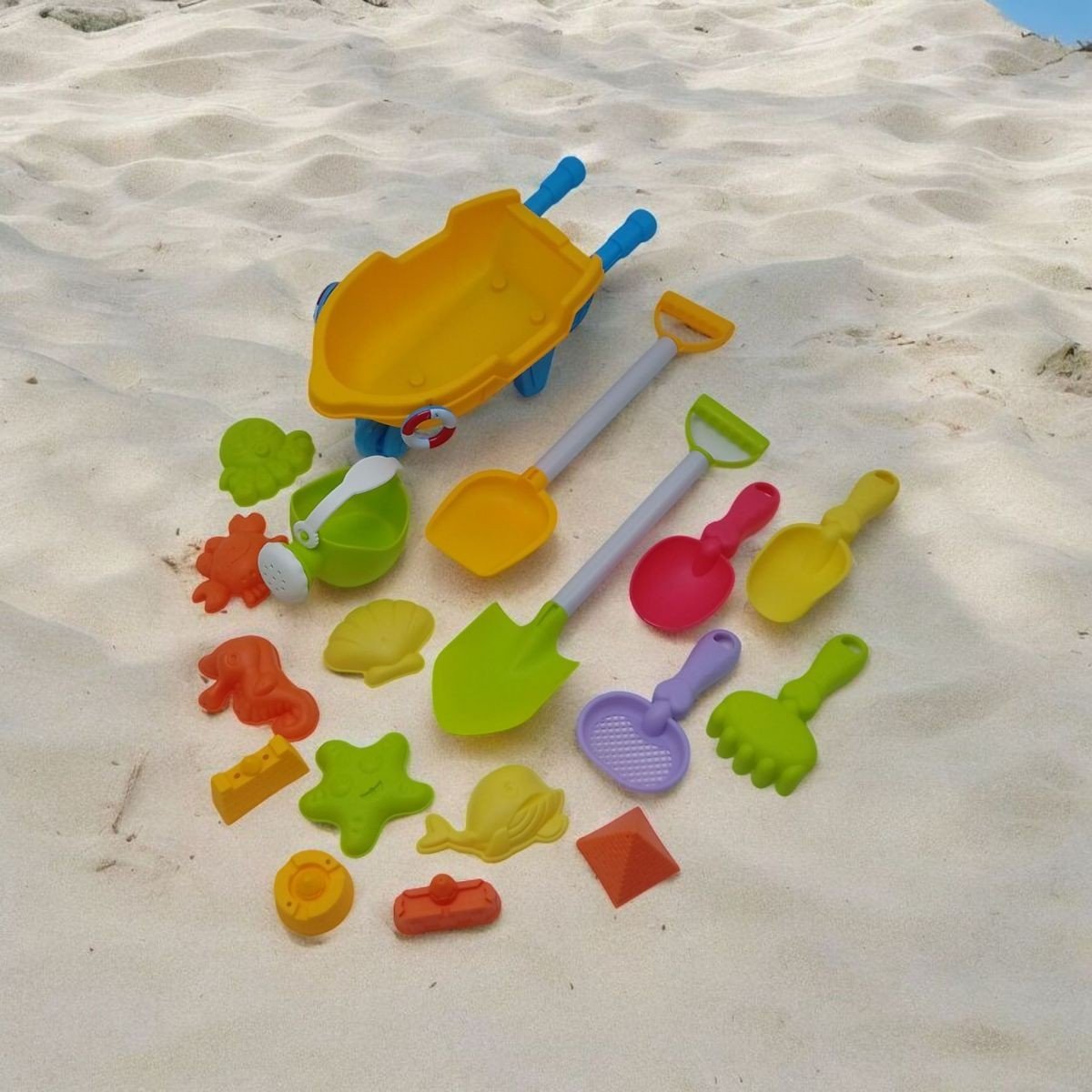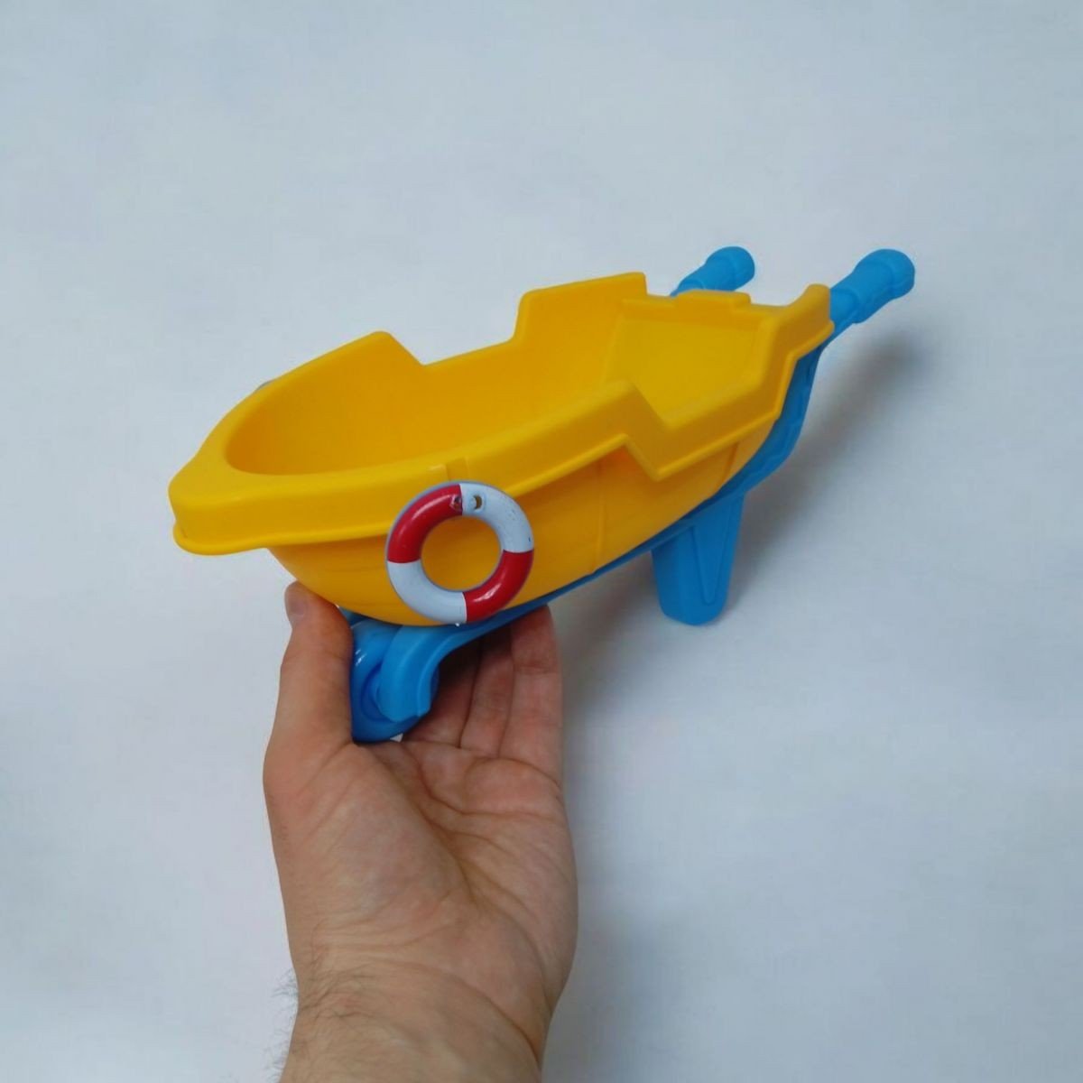 Пісочний набір — ідеальний набір для цікавих ігор на свіжому повітрі. У набір входить яскрава тачка-човник розміром 25 х 12 х 10 см, граблі, дві великі та дві маленькі лопатки, сито, лієчка та 10 різноманітних формочок. Всі елементи виконані із міцного та безпечного пластику.