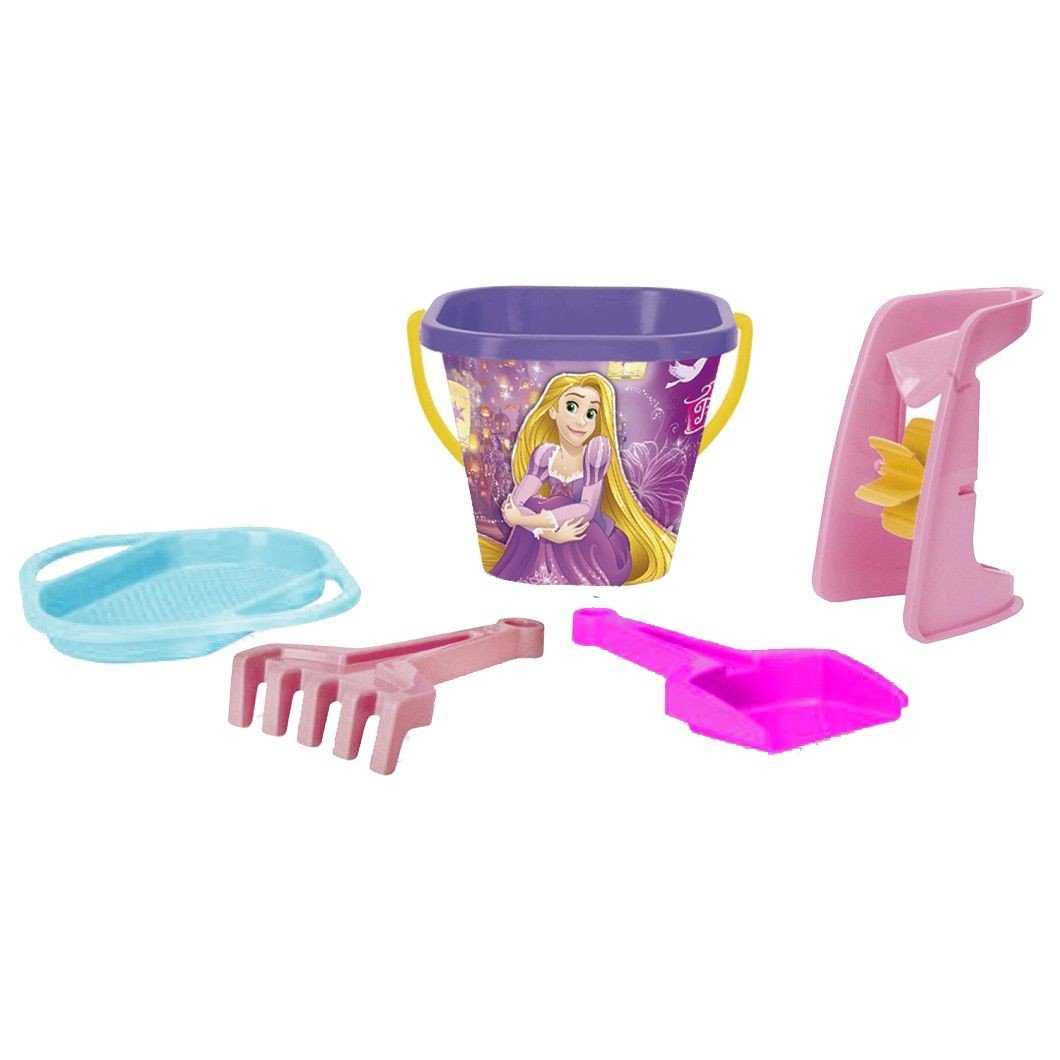 Пісочний набір виконаний з яскравим малюнком принцеси Disney. У комплекті: барвисте пластикове відерце з ручкою (15х16х16 см), лопатка, грабельки, сито та піщаний млин.