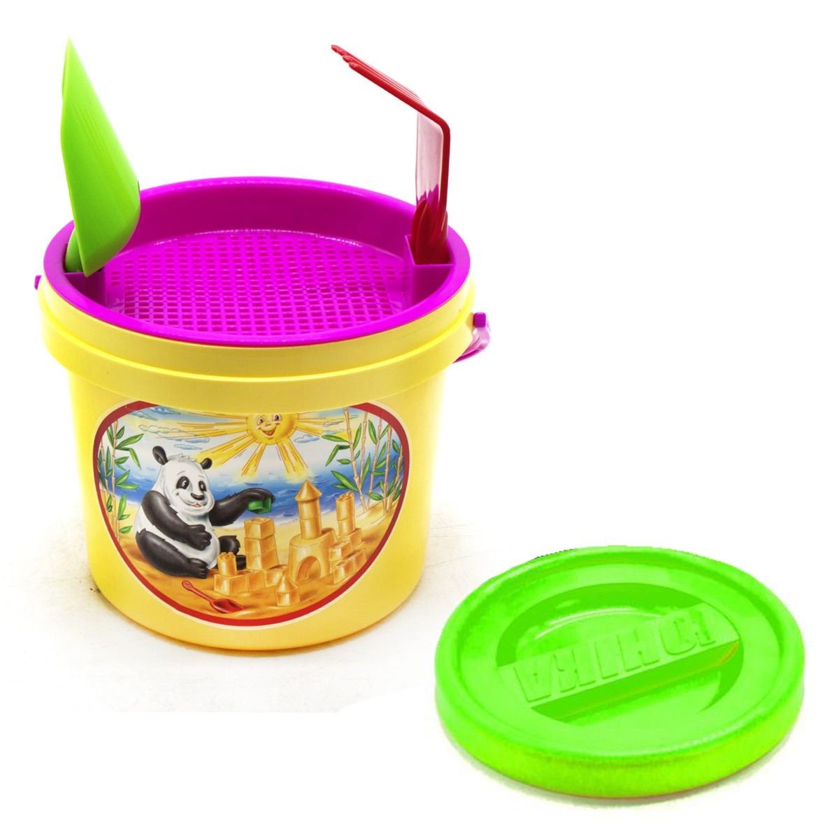 Яскравий пісочний набір. У комплекті: пластикове відерце з барвистою наклейкою і кришечкою (14 х 17 см), ситечко, лопатка і грабельки. Набір ідеально підійде для ігор в пісочку.