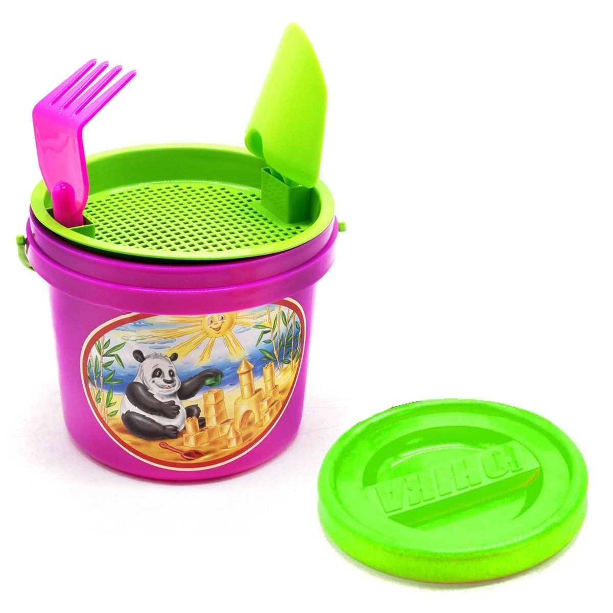 Яскравий пісочний набір. У комплекті: пластикове відерце з барвистою наклейкою і кришечкою (14 х 17 см), ситечко, лопатка і грабельки. Набір ідеально підійде для ігор в пісочку.
