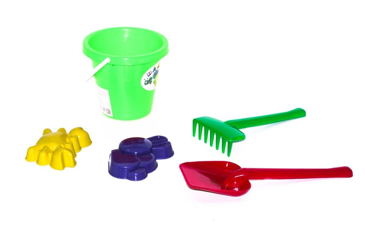 Набір для піску "Бамсік малий". У набір входить 5 елементів: відро (15 х 14 х 12 см), лопатка (24,5 см), граблі (20 см) і 2 пасочки. Підходить для гри вдома, на вулиці, в саду або на пляжі.