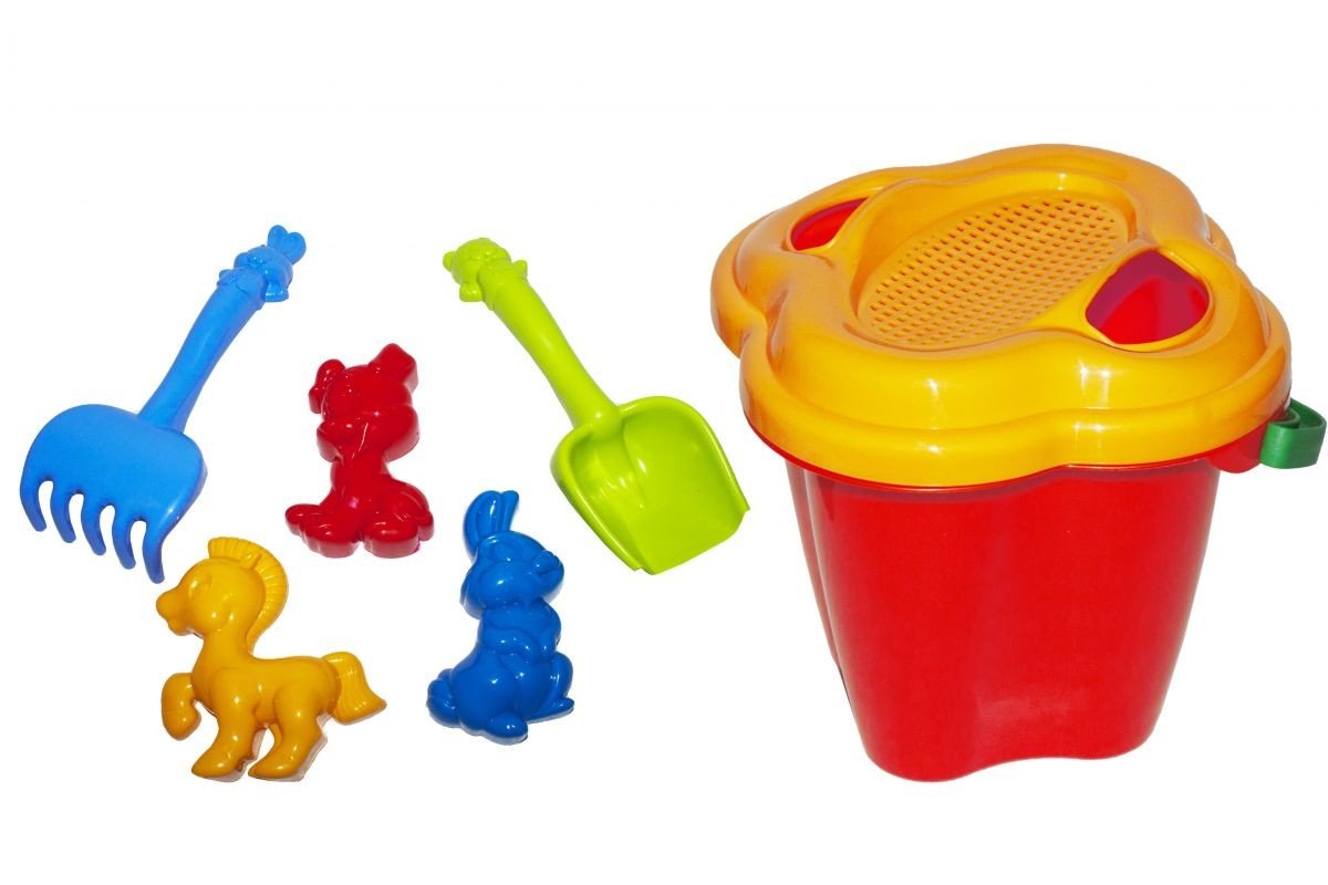 Пісочний набір "Дзвіночок" №1. У набір входить: відро з ситом, граблі, лопатка і 3 пасочки. Підходить для гри вдома, на вулиці, в саду і на пляжі. Розмір лопатки і грабельок - 20 см, розмір пасочки - 11 х 7 см, відро - 14 х 14 х 14 см.