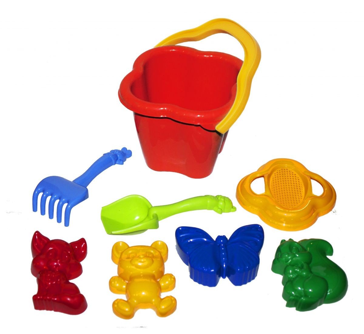 Пісочний набір "Дзвіночок" №2. У набір входить: відро з ситом, граблі, лопатка і 4 пасочки. Підходить для гри вдома, на вулиці, в саду і на пляжі. Розмір лопатки і грабельок - 21 см, розмір пасочки - 10 - 12 см, відро - 13,5 х 13,5 х 12,5 см.