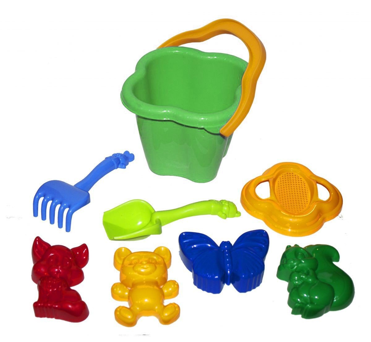 Пісочний набір "Дзвіночок" №2. У набір входить: відро з ситом, граблі, лопатка і 4 пасочки. Підходить для гри вдома, на вулиці, в саду і на пляжі. Розмір лопатки і грабельок - 21 см, розмір пасочки - 10 - 12 см, відро - 13,5 х 13,5 х 12,5 см.