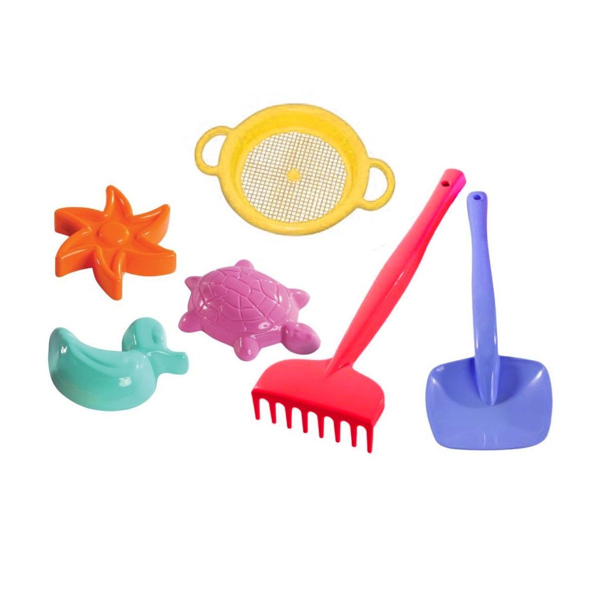 Пісочний набір буде цікавим подарунком для дитини. У наборі є: грабельки, лопатка, ситечко і 3 пасочки. Виконаний з якісного і міцного пластику. Для дітей від 1 року.