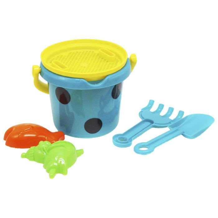 Бренд: М.Тoys Упаковка: Сітка Колір: Бірюзовий Вага з упаковкою: 120 г Габарити в упаковці: 14 x 16 x 20 см Габарити без упаковки: 16 x 12 x 14 см Країна виробник: Україна Матеріал: Пластик Комплектація: Відро, сито, 2 пасочки, граблі, лопатка