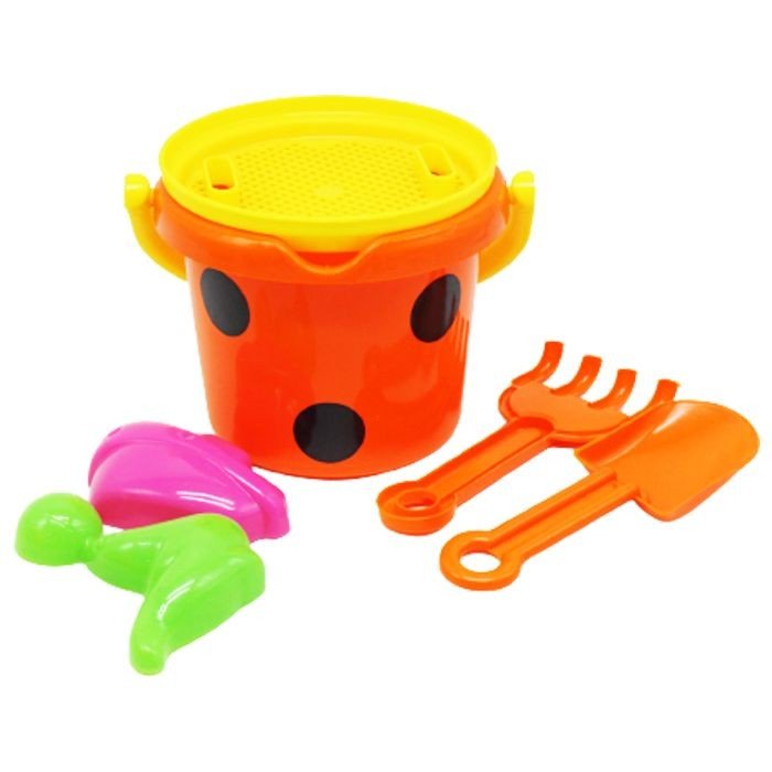 Яскравий піщаний набір. У комплекті: пластикове відерце (14 х 16 см), ситечко, 2 пасочки, лопатка та грабельки. Набір ідеально підійде для ігор у пісочниці чи пляжі. Довжина інструментів - 19 см. Виконано з якісного та безпечного матеріалу, цебро міцне та надійне. Обовʼязково сподобається малечі від 3-х років.