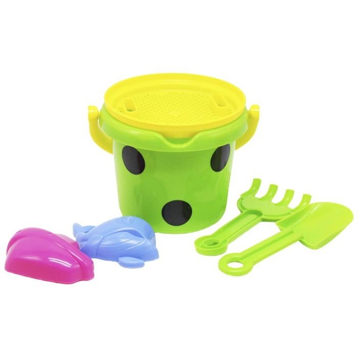 Бренд: М.Тoys Упаковка: Сітка Колір: Зелений Вага з упаковкою: 120 г Габарити в упаковці: 14 x 16 x 20 см Габарити без упаковки: 16 x 12 x 14 см Країна виробник: Україна Матеріал: Пластик Комплектація: Відро, сито, 2 пасочки, граблі, лопатка