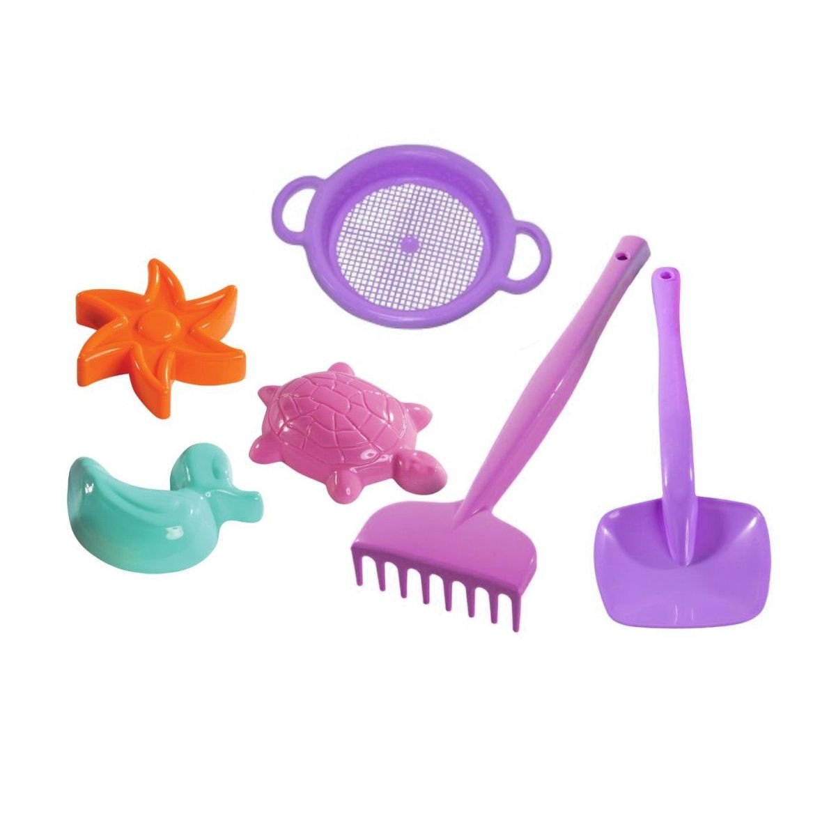 Пісочний набір буде цікавим подарунком для дитини. У наборі є: грабельки, лопатка, ситечко і 3 пасочки. Виконаний з якісного і міцного пластику. Для дітей від 1 року.