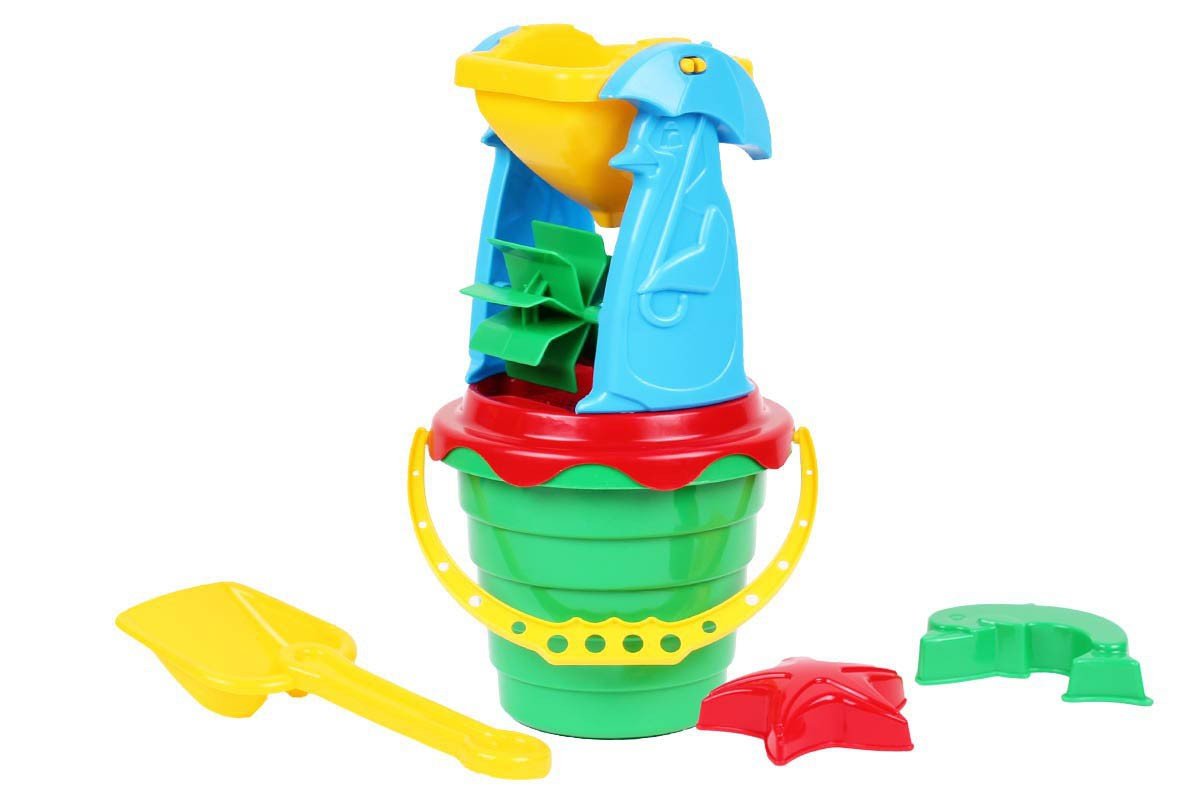 Яскравий пластиковий пісочний набір. У комплекті: відерце (15 х 9 х 14 см), ситечко (14 х 14 см), лопатка, млин і 2 пасочки. Гра з млинком дуже цікава. Вгорі у неї знаходиться ківш, в який можна засипати пісок, або заливати воду, і коли пісочок буде висипатися вниз - активується механізм-крутилка.