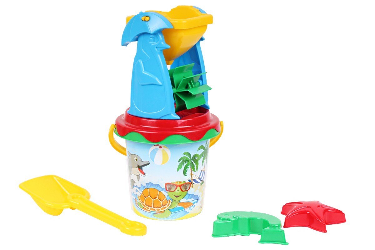 Яскравий пластиковий пісочний набір. У комплекті: відерце (16 х 10 х 14 см), ситечко (14 х 14 см), лопатка, млин і 2 пасочки. Гра з млинком дуже цікава. Вгорі у неї знаходиться ківш, в який можна засипати пісок, або заливати воду, і коли пісочок буде висипатися вниз - активується механізм-крутилка.