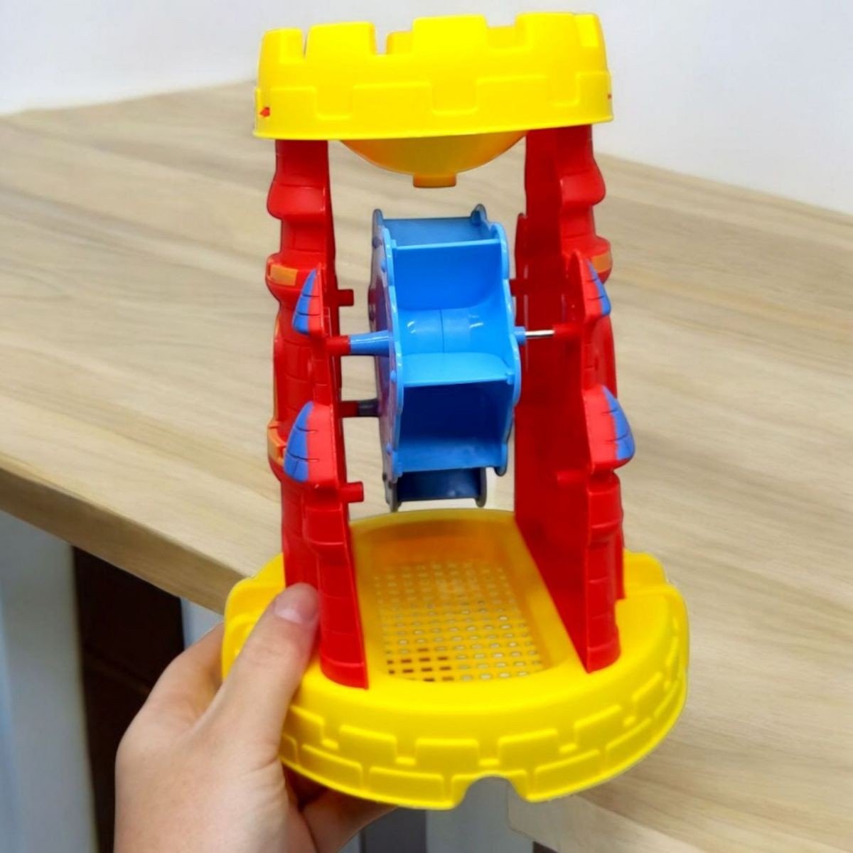 Набір для піску у формі замку - справжня мрія маленького архітектора! Яскраві елементи, формочки з вежами та інструменти для копання допоможуть створити власне королівство просто на пляжі чи в пісочниці. Усе компактно вміщується у вежу, що зручно для зберігання та перенесення. Особливості: розмір набору: 29×22×16 см; розмір млина: 16×16×22 см; вежа-замок слугує водночас ситом для піску і млином. У комплекті: млин, лійка, грабельки, лопатка, 4 будівельних формочки. Виготовлено з безпечного, міцного пластику. Такий набір розвиває дрібну моторику, фантазію та інтерес до творчої гри.