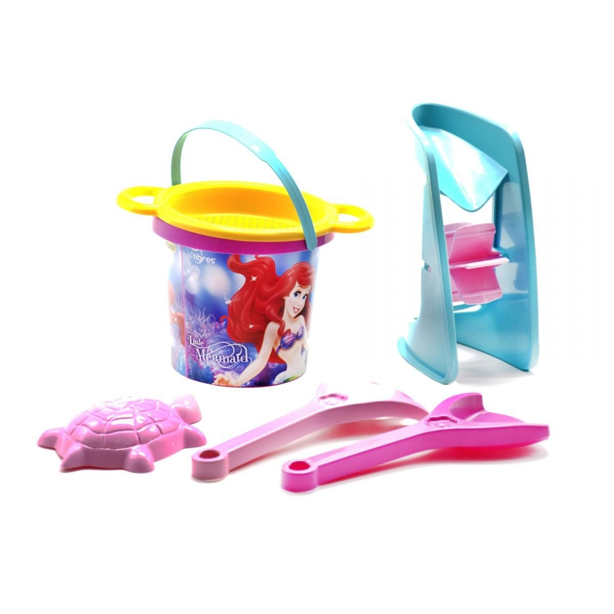 Пісочний набір з 6-ти предметів. У комплекті: яскраве пластикове відерце з термонаклейка із зображенням принцеси, ситечко, млинок, лопатка, грабельки і пасочка. Розмір відерця: 12 х 14 см.