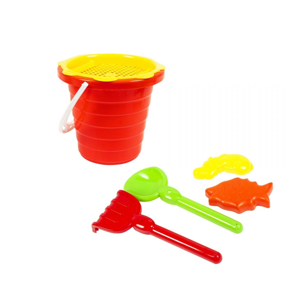 Пісочний набір, середній. Набір включає в себе 6 елементів: відро (16 х 16 х 14 см), лопатка і граблі (24 см), сито, 2 пасочки.
