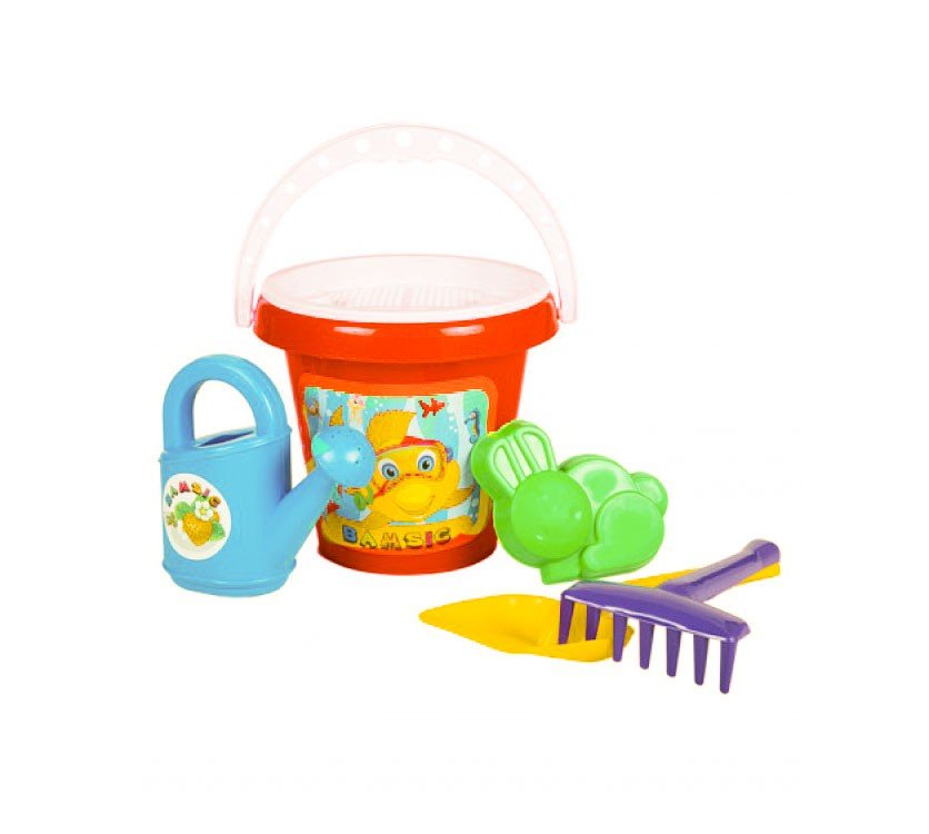 У набір входить 6 елементів: відро (20 х 18,5 х 17 см), лопатка (25 см), граблі (19,5 см), лека, сито і пасочка. Підходить для гри вдома, на вулиці, в саду або на пляжі.