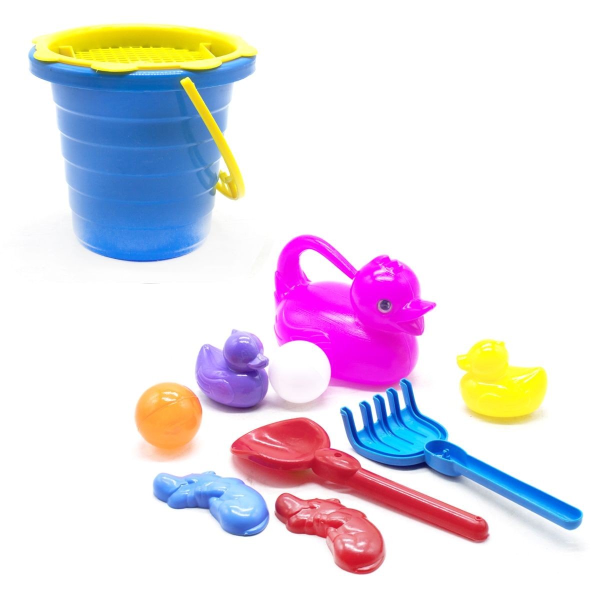 Комплектація: Пластикове відерце, ситечко, лопатка, грабельки, 2 пасочки, 2 пластикових м'ячика, 2 качечки