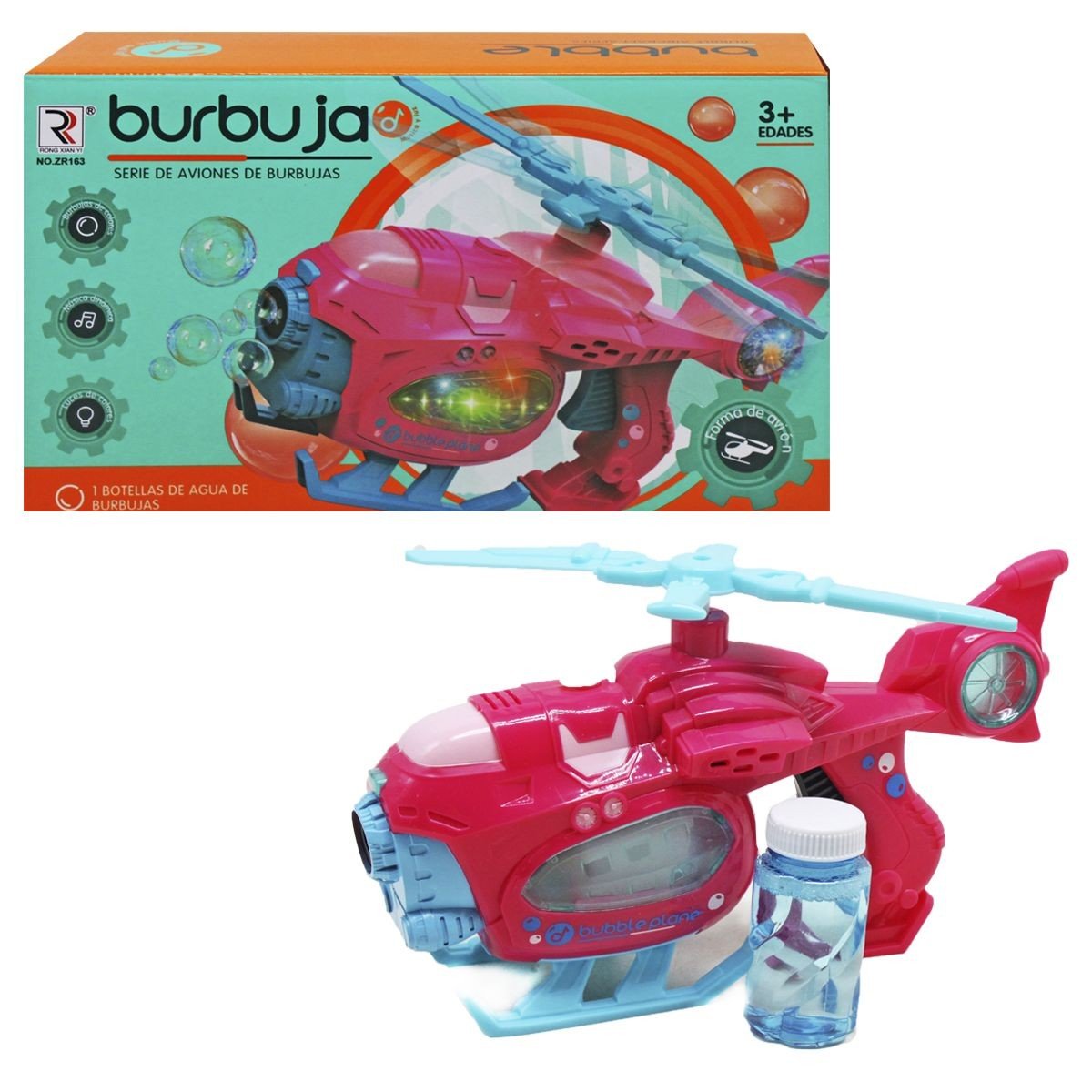 Оригінальна установка для пускання мильних бульбашок - "Гвинтокрил". Іграшка працює від 3-х батарейок АА. При включенні включається різнокольорове підсвічування корпусу та звуки вертольота, іграшка починає видувати мильні бульбашки. Лопаті обертаються при натисканні на курок. Щоб заправити іграшку мильними бульбашками, потрібно залити їх усередину через отвір зверху, використовуючи вирву, яка є в комплекті.