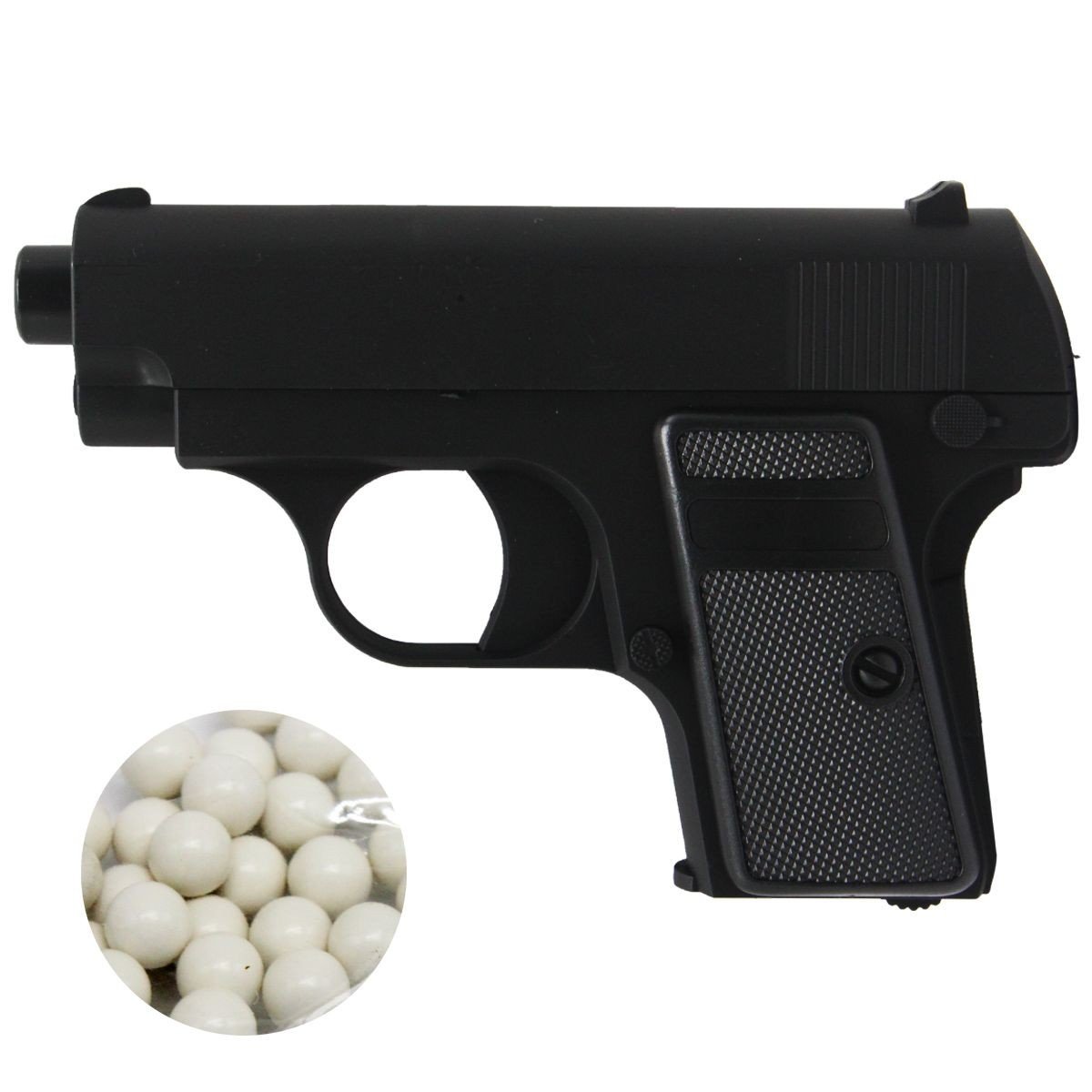 Пластиковий пістолет із кульками в комплекті. Магазин може містити 14 кульок діаметром 6мм, які вистрілюють з дула за допомогою спрингового механізму. Щоб вийняти магазин, потрібно натиснути кнопку курка. Вставити кульки в магазин і пересмикнути затвор. Потім можна стріляти. Розмір пістолета – 14х10х3 см.