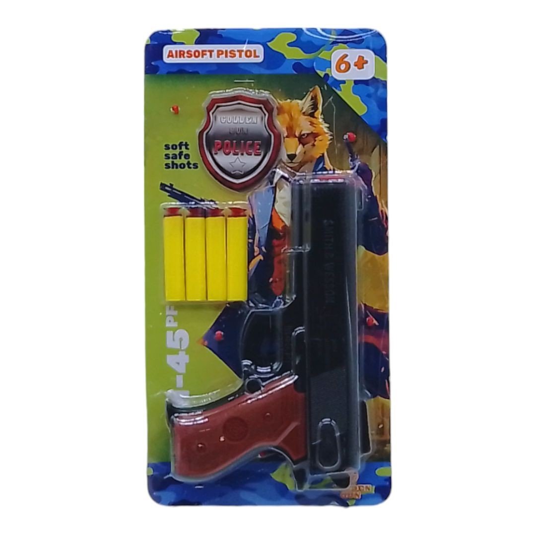 Безпечна та цікава зброя для ігор на свіжому повітрі або в приміщенні. Він стріляє мʼякими поролоновими набоями на присосках, що робить його безпечним для дітей. Пістолет виконаний із міцного пластику, має зручний дизайн, легко заряджається та ідеально підходить для активних ігор. 4 патрони і поліцейський значок в комплекті.