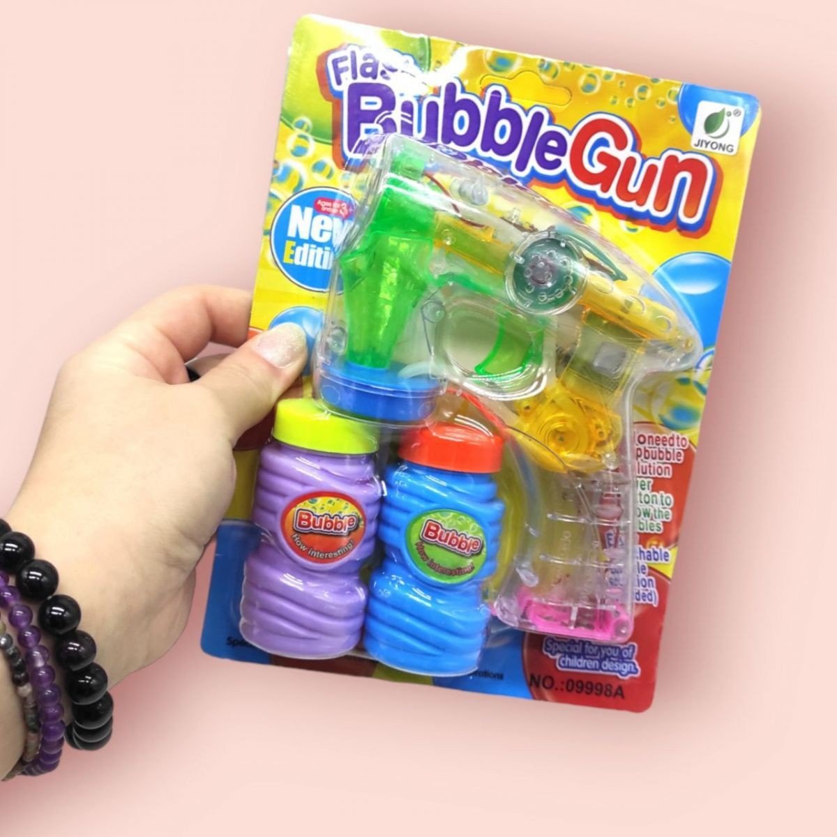 Бренд: Jiyong Упаковка: Планшет Колір: Різнобарв'я Тип ел-тів живлення: Батарейки ААА Кількість ел-тів живлення: 3 Ел-ти живлення в комплекті: Ні Вага з упаковкою: 250 г Габарити в упаковці: 21 x 15.5 x 4 см Країна виробник: Китай Матеріал: Пластик Комплектація: Пістолет, 2 баночки з бульбашками
