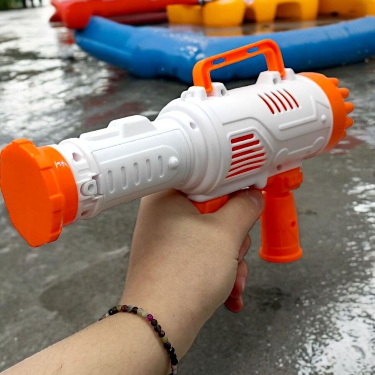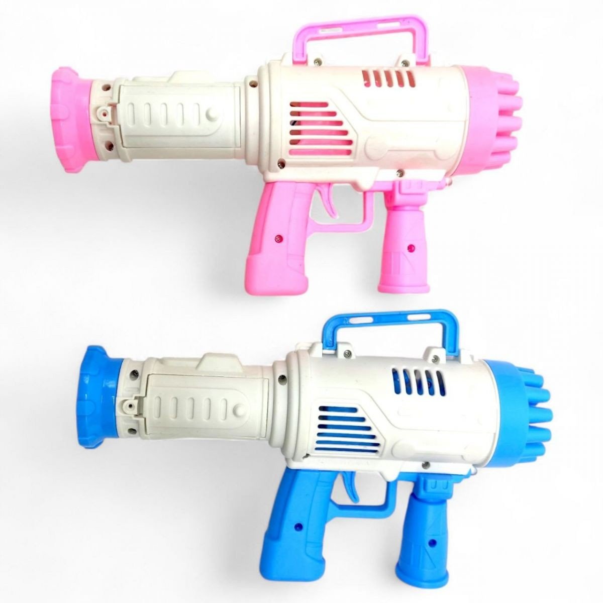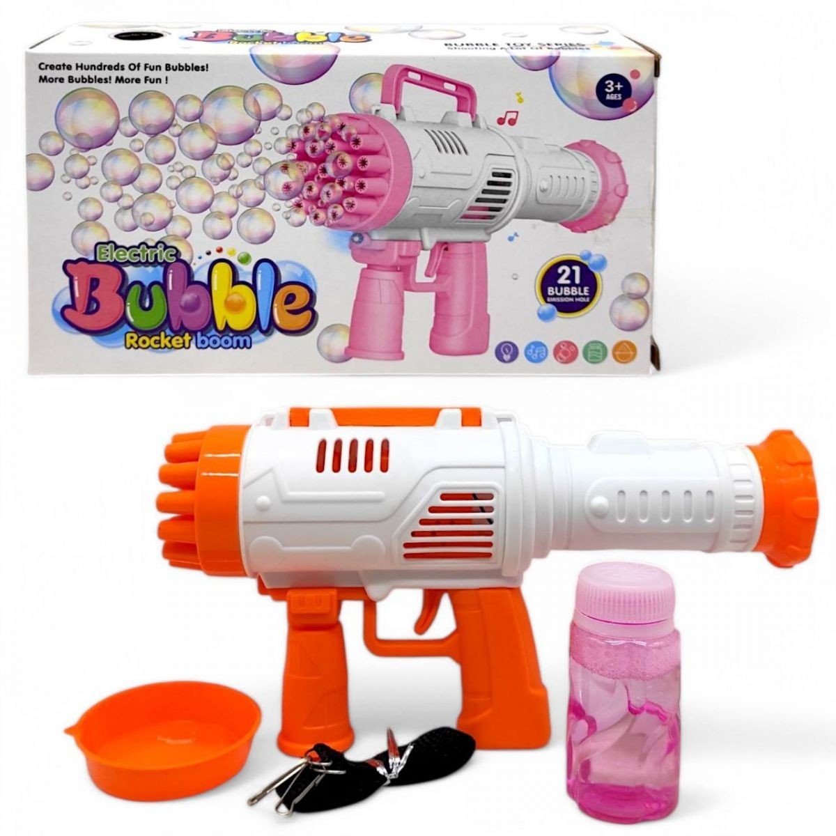 Базука-бульбашкомет— яскрава та захоплива іграшка для дітей і дорослих! Просто занурте іграшку в мильний розчин, натисніть на курок — і з 21 отвору вирвуться десятки веселих бульбашок. Оснащена підсвіткою для ще більшої видовищності, особливо у темряві. Працює від 3 батарейок типу AA (не входять у комплект).