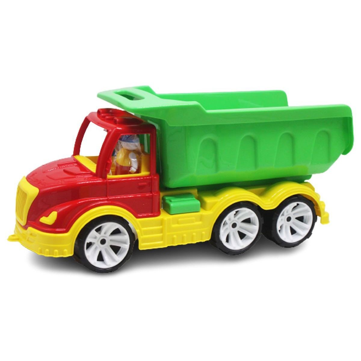Пластикова машинка вантажівка-самоскид. У вантажівки піднімається кузов. Розмір іграшки 51х23х18 см, діаметр коліс 9 см. У комплекті є 2 фігурки - водій та його напарник. Іграшка виконана із міцного пластику.