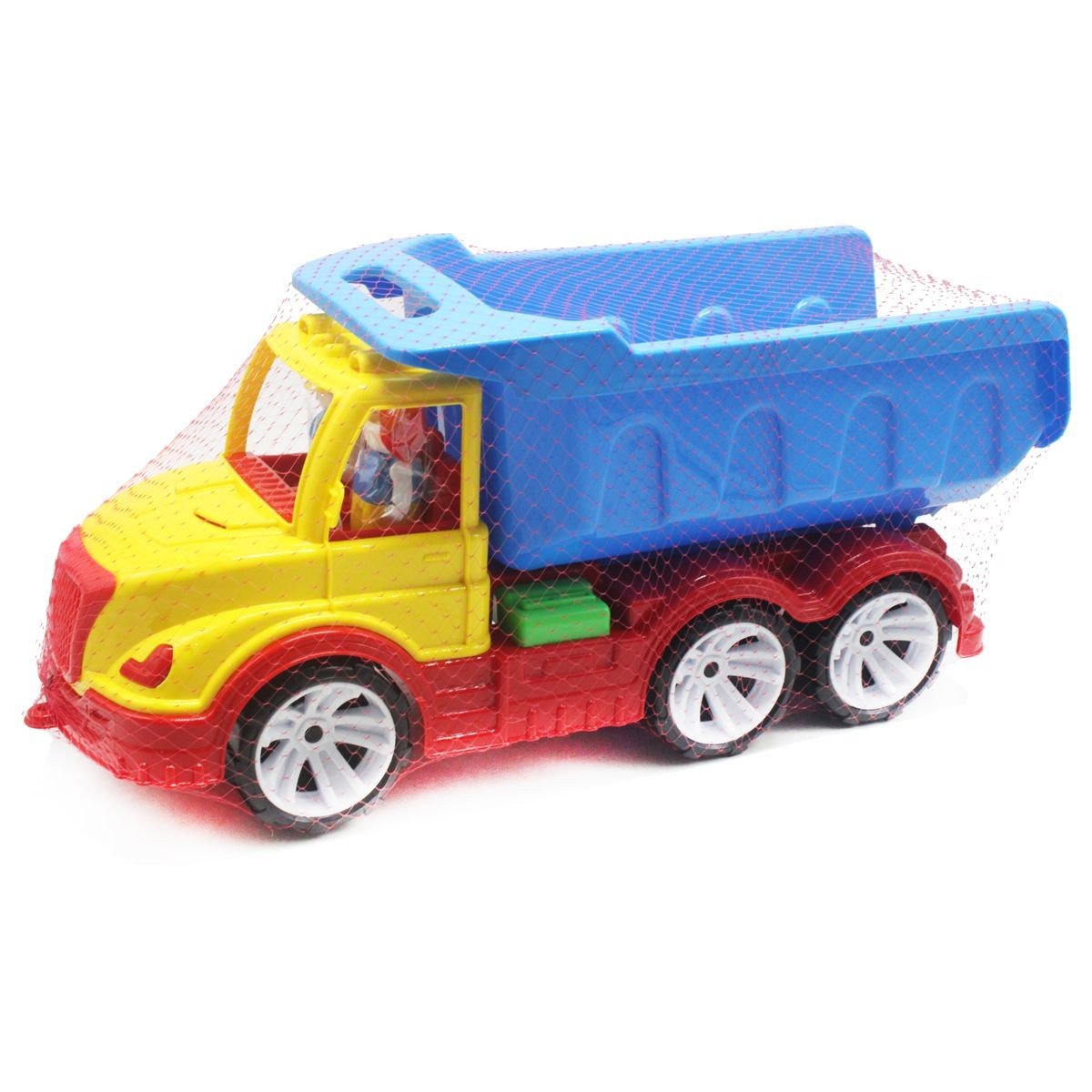 Пластикова машинка вантажівка-самоскид. Біля вантажівки піднімається кузов. Розмір іграшки 51х23х18 см, діаметр коліс 9 см. У комплекті є 2 фігурки - водій та його напарник. Іграшка виконана із міцного пластику.