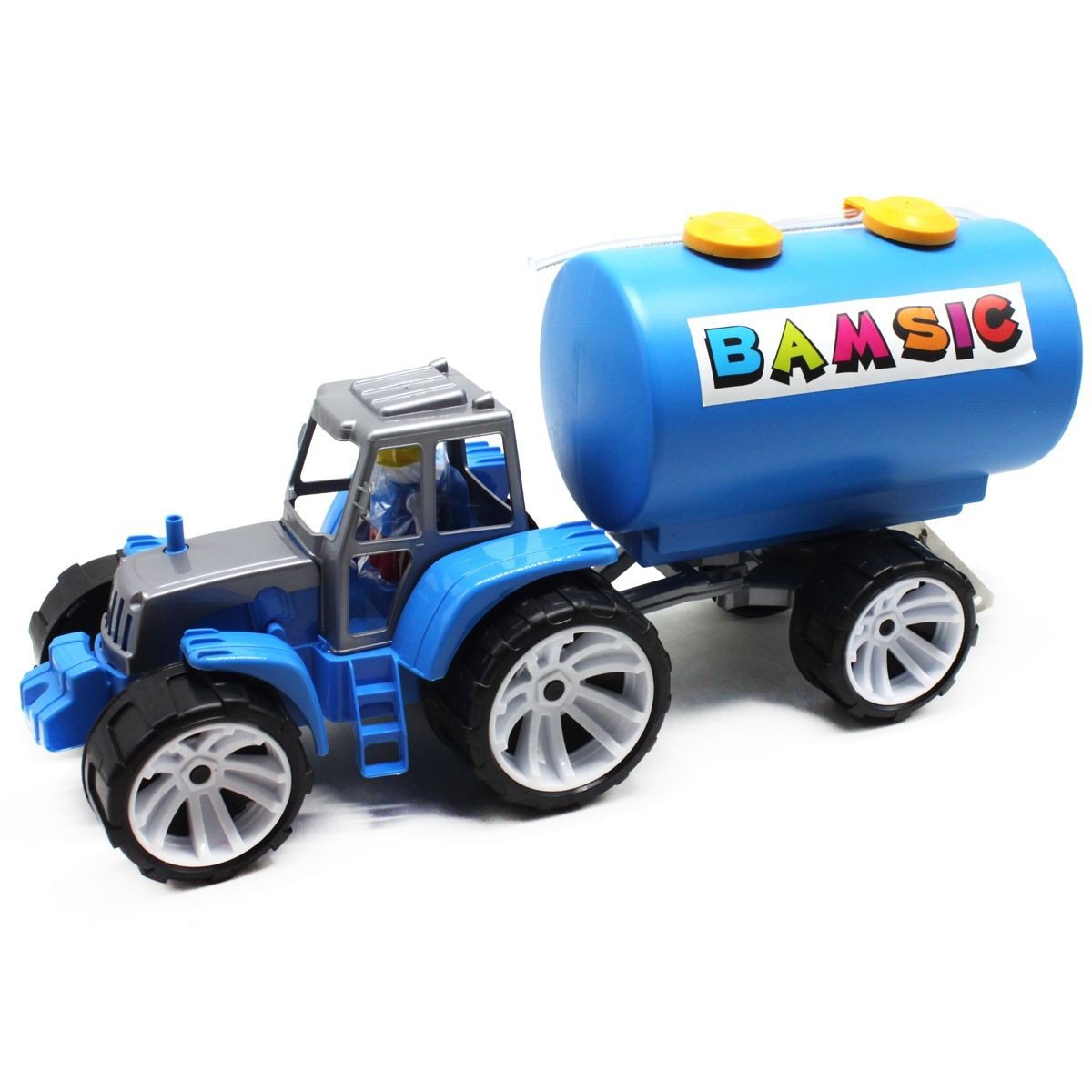 Пластиковий набір включає трактор з фігуркою водія і причіп-бочку. У діжку можна налити будь-яку рідину і завдяки трубочці - з легкістю злити її. Розмір трактора 28х19х20 см, причепа – 24х24х17 см. Комплект виконаний з якісного та безпечного пластику.