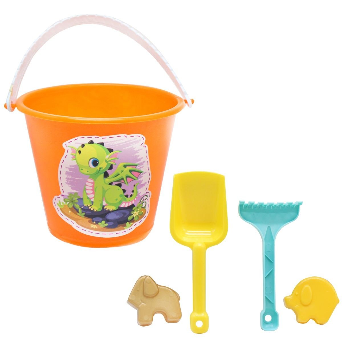 Пластиковий набір "Дракоша". У наборі є: відерце, 2 формочки для піску, грабельки, лопатка. Довжина лопатки - 18 см. Грабельок - 14,5 см. Виконано з якісного пластику.