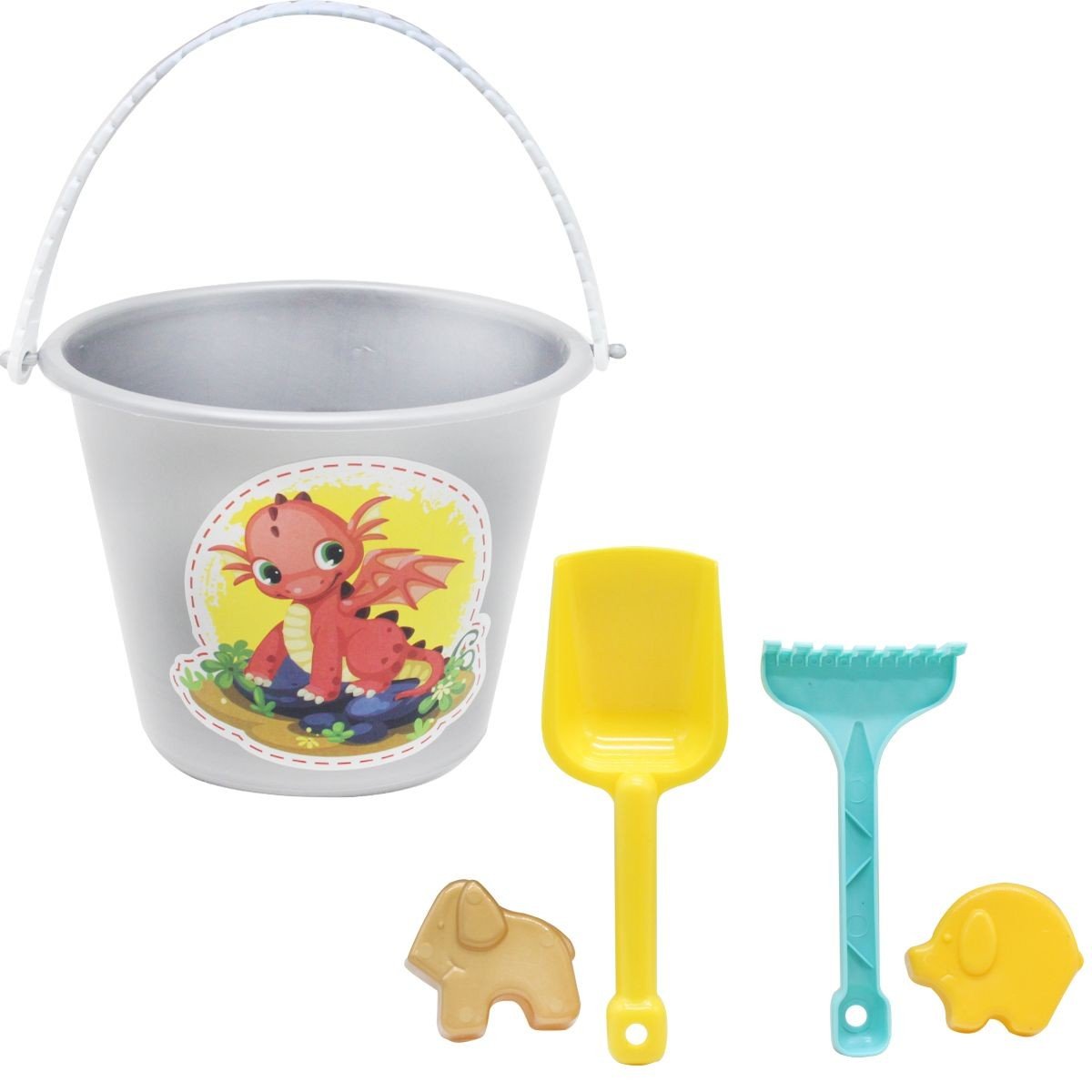 Пластиковий набір "Дракоша". У наборі є: відерце, 2 формочки для піску, грабельки, лопатка. Довжина лопатки - 18 см. Грабельок - 14,5 см. Виконано з якісного пластику.