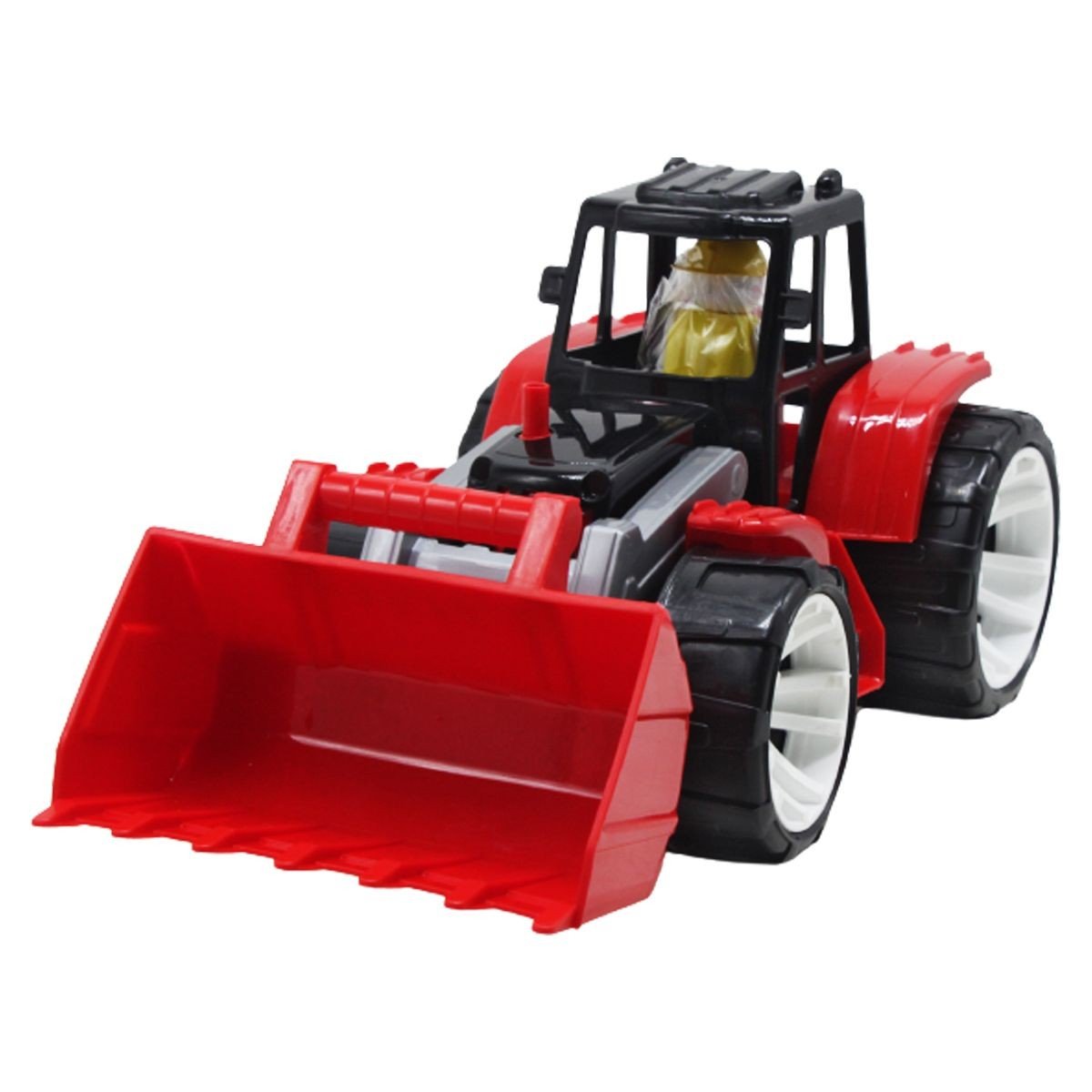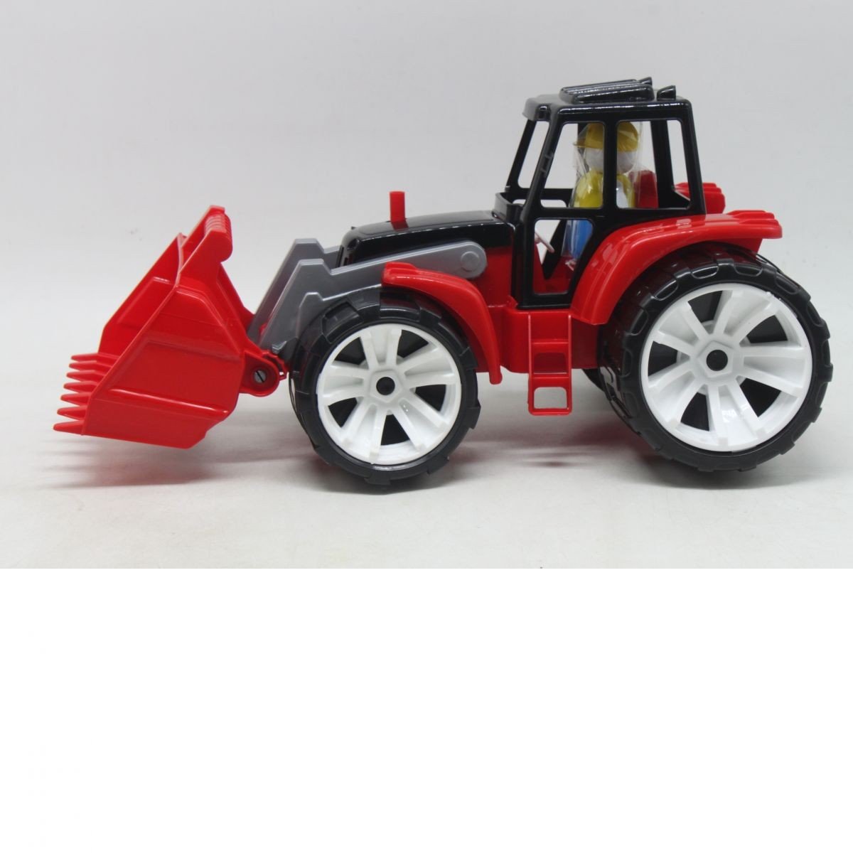 Пластиковий трактор з ковшем. Рухомий ковш. Всередині трактора розташована фігурка робочого, готового до пригод на фермі або будівельному майданчику. Дитина може вигадати різноманітні сценарії гри, де цей трактор використовується для виконання різних завдань та розвиває творчий підхід до гри.