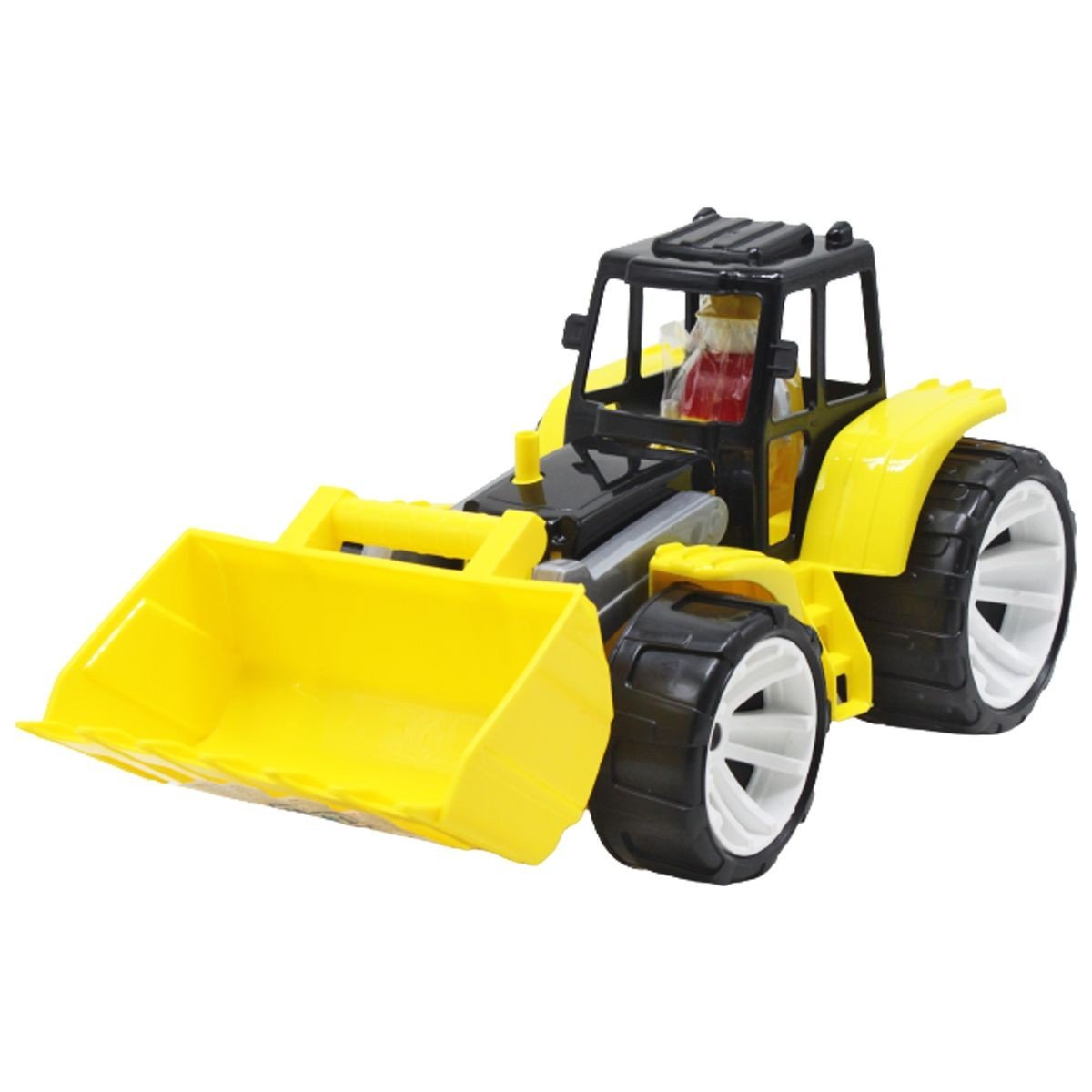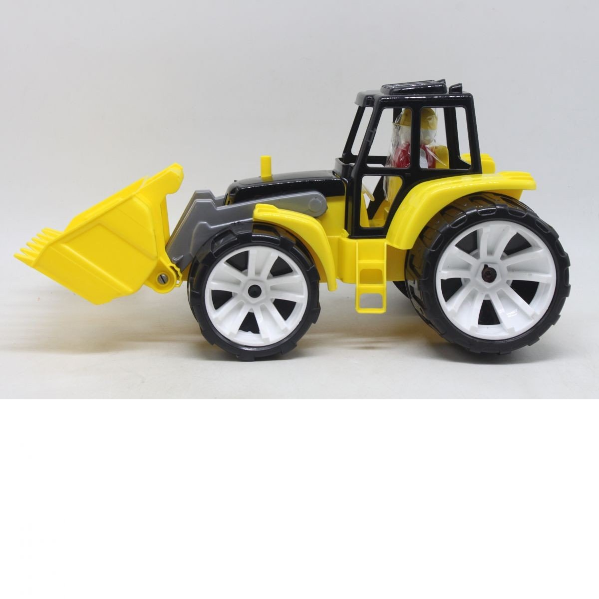 Пластиковий трактор з ковшем. Рухомий ковш. Всередині трактора розташована фігурка робочого, готового до пригод на фермі або будівельному майданчику. Дитина може вигадати різноманітні сценарії гри, де цей трактор використовується для виконання різних завдань та розвиває творчий підхід до гри.