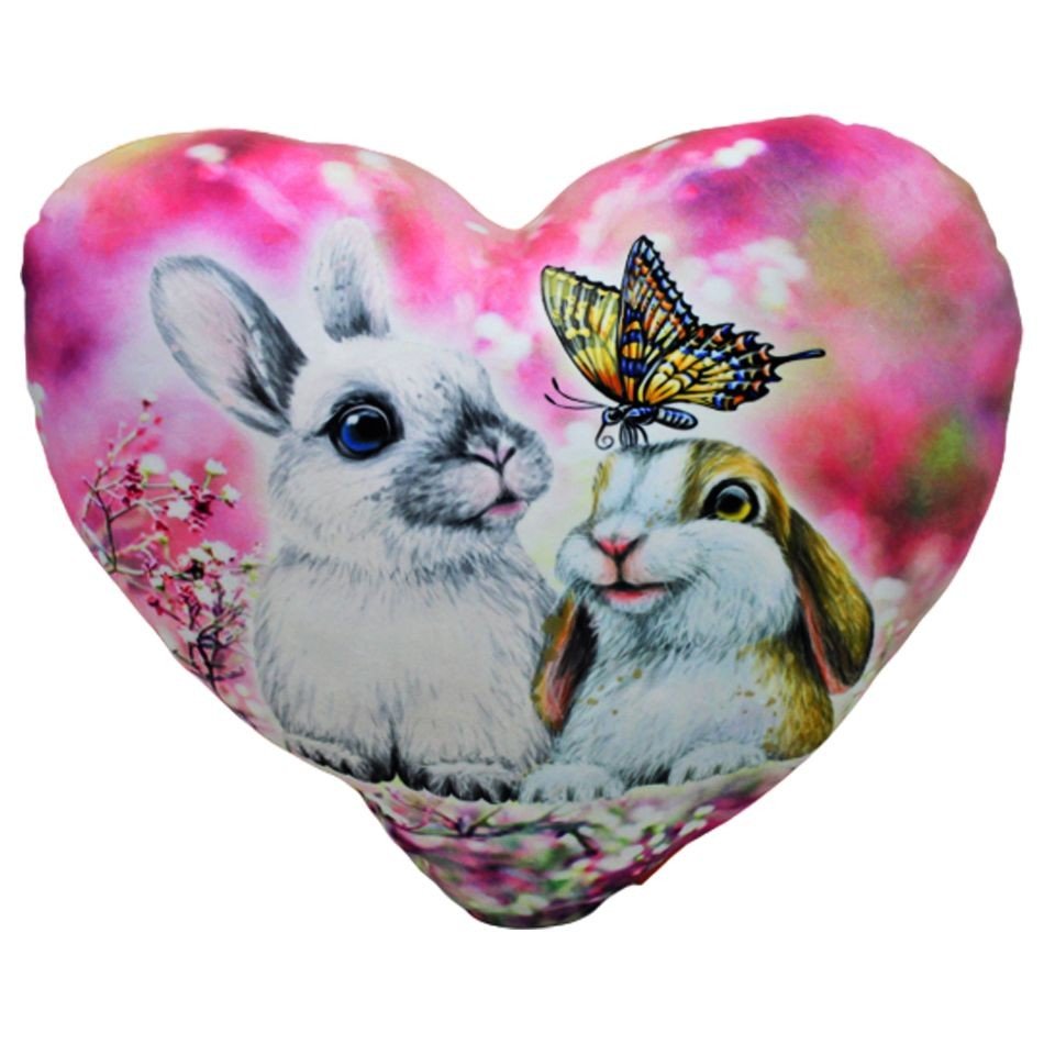 Мила декоративна подушечка у формі серця, на якій зображені два кролики. Буде чудовим подарунком та гарною прикрасою інтер'єру. Дуже приємна на дотик, м'який синтепоновий наповнювач. Розмір: 40х35х10 см.