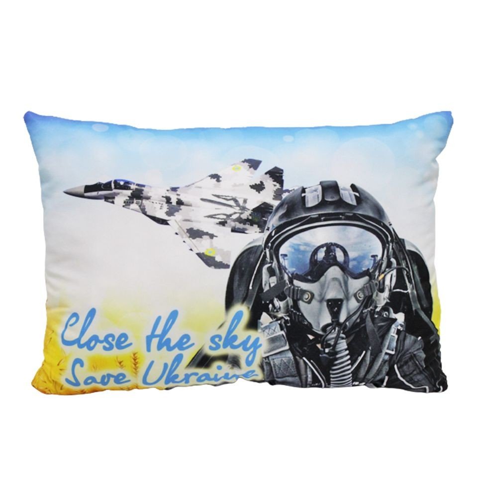 Сувенірна подушка з патріотичним зображенням примари Києва та підписом "Close the sky! Save Ukraine". Така подушка стане чудовим подарунком та прикрасою інтер'єру. Розмір: 33х25 см.