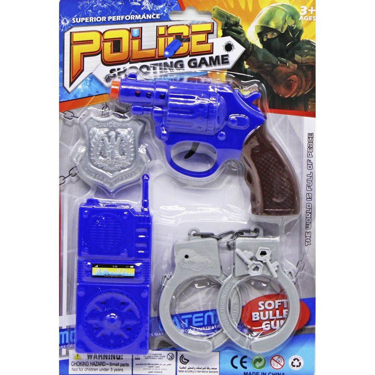Бренд: MIC Упаковка: Планшет Колір: Синій Вага з упаковкою: 120 г Габарити в упаковці: 3 x 21.5 x 31.5 см Габарити без упаковки: 3 x 15 x 11 см Країна виробник: Китай Матеріал: Пластик Комплектація: Пістолет, наручники, поліцейський жетон, рація