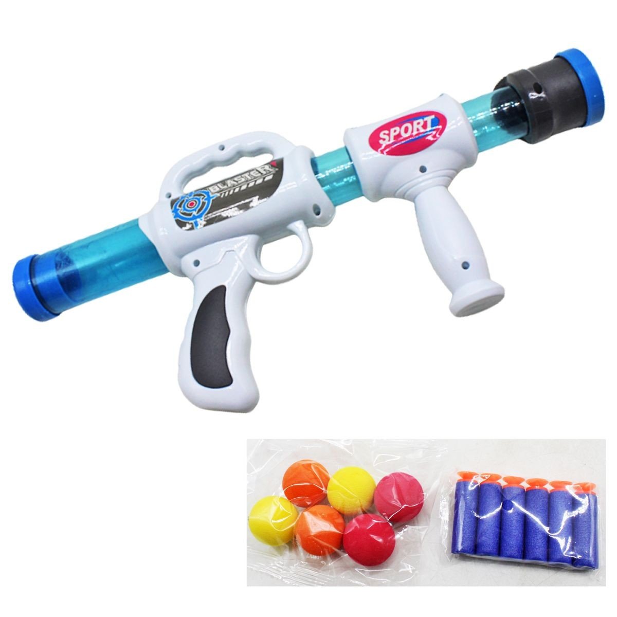 Упаковка: Пакет Колір: Білий, синій Вага з упаковкою: 225 г Габарити в упаковці: 5 x 46 x 20 см Габарити без упаковки: 5 x 37 x 17 см Країна виробник: Китай Матеріал: Комбінований Комплектація: Рушниця, 6 поролонових патронів, 6 кульок, змінна насадка на дуло