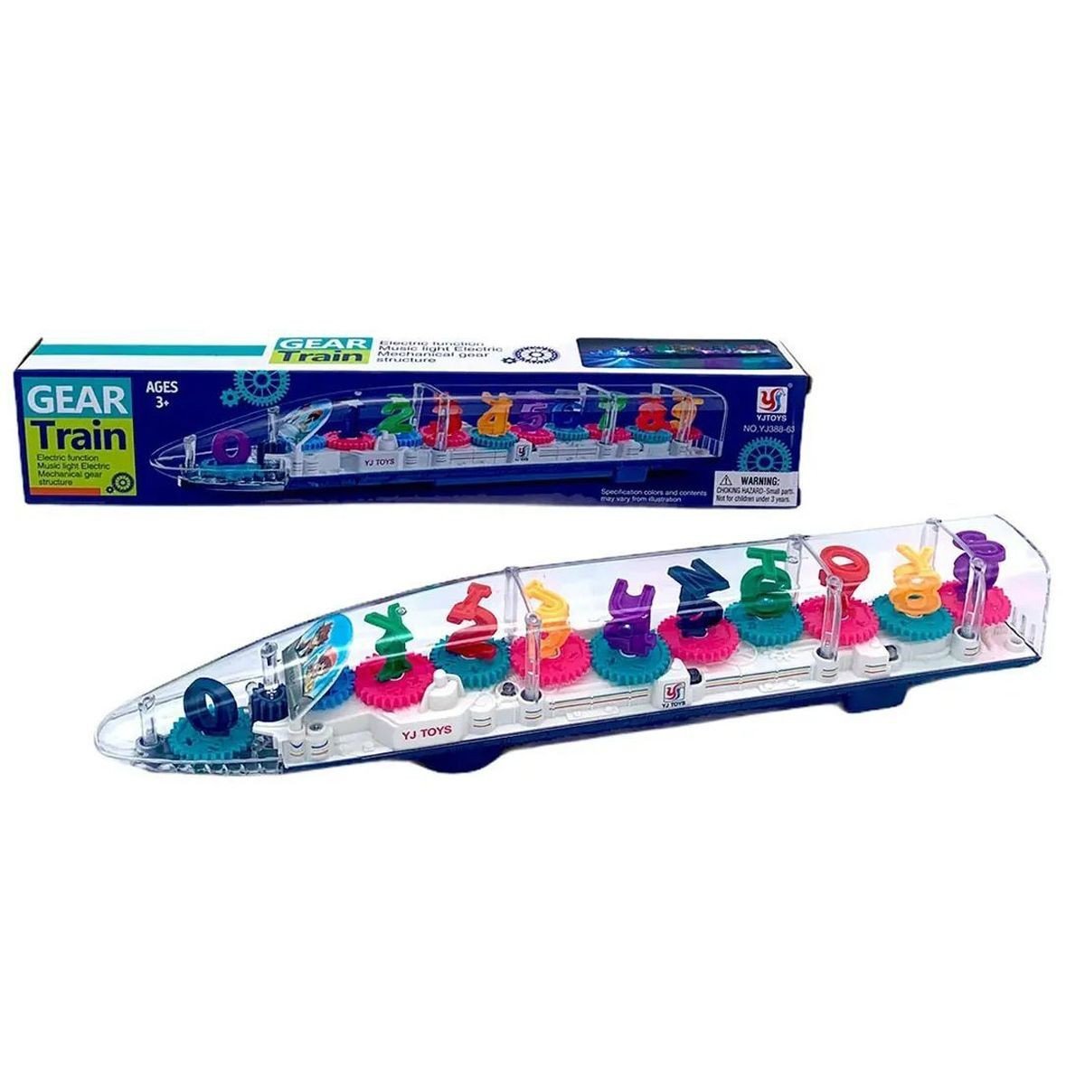 Оригінальна іграшка – потяг. Іграшка прозора, всередині розташована безліч рухливих шестерень, на яких встановлені різнокольорові цифри та літери англійського алфавіту. Має 2 режими роботи: перший режим - різнокольорове підсвічування, під час другого включається підсвічування з веселою мелодією та хаотичним рухом. Розмір поїзда 37х5х5 см. Для дітей віком від 3-х років.